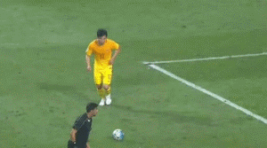 在格德斯第28分钟为鲁能取得领先后,北京国安获得角球机会,鲁能球员将球解围出,禁区前的蒿俊闵将球向前一垫,随后,便是那燃爆全场的一幕! 32岁的蒿俊闵,速度完成碾压比自己小5岁的李磊,将球传给了5秒后的自己!