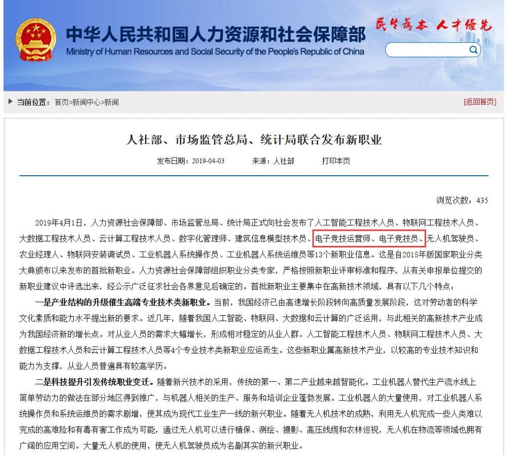 腾讯体育4月3日讯 2019年4月1日,人力资源社会保障部、市场监管总局、统计局正式向社会发布了13个新职业信息,其中就包括电子竞技运营师、电子竞技员。 其中提到:“近几年,在国际赛事的推动下,基于计算机的竞技项目发展迅猛,电子竞技已成为巨大的新兴产业,电子竞技运营师和电子竞技员职业化势在必行。” 2018年起,电竞话题热度大增,这一年,电子竞技成为亚运会表演项目,中国队收获2金1银,这一年,中国电竞战队IG在韩国获得“英雄联盟”全球总决赛冠军,一时轰动舆论。 而且,随着电子竞技引受关注程度的提高,越来越多投资商与品牌也加入电竞大家庭,李宁、耐克等传统体育品牌的入局,为电竞资本注入新活力。 此次一同发布的13个新职业分别是: 人工智能工程技术人员、物联网工程技术人员、大数据工程技术人员、云计算工程技术人员、数字化管理师、建筑信息模型技术员、电子竞技运营师、电子竞技员、无人机驾驶员、农业经理人、物联网安装调试员、工业机器人系统操作员、工业机器人系统运维员。 值得注意的是,之前央视报道的人社部拟发布新职业有15个,正式发布后,少了城市轨道交通线路工、城市轨道交通列车检修工这两个新职业。 关于新职业是如何产生等问题,文章也做出解释: 如何界定新职业,新职业信息包括哪些内容? 新职业是指《中华人民共和国职业分类大典》(以下简称大典)中未收录的,社会经济发展中已有一定规模从业人员,且具有相对独立成熟的专业、技能要求的职业。 新职业信息主要包括:职业名称、职业编码、职业定义和主要工作任务等内容,与大典中的职业信息基本一致。对具有“环保、低碳、循环”等绿色特征的职业标示为绿色职业,统一以“绿色职业”的汉语拼音首字母“L”标识。 我国何时建立新职业信息发布制度,有何意义? 建立新职业信息发布制度是国际通行做法,也是职业分类动态调整机制的重要内容。1999年,我国颁布了首部大典,共收录了1838个职业。进入新世纪后,随着我国经济社会的快速发展,产业结构调整、科学技术进步、大众创业创新,社会上涌现出许多新业态,亟待在国家层面上予以认可规范,新职业信息发布制度应运而生。首次新职业信息发布工作始于2004年,至2009年,累计发布了12批次120多个新职业。2010年后,国家启动了大典修订工作。2015年7月,颁布了2015年版大典。2015年版大典颁布近4年来,随着经济社会发展、科学技术进步和产业结构调整,新产业新业态新模式滋生孕育出新职业,亟需重启新职业信息发布工作。 新职业信息发布制度的意义。首先,有利于促进就业创业。通过发布新职业信息对新职业进行规范,加快开发就业岗位,扩大就业容量,强化职业指导和就业服务,促进劳动者就业创业。其次,有利于促进职业教育和职业培训改革。推动专业设置、课程内容与社会需求和企业生产实际相适应,促进职业教育培训质量提升,实现人才培养培训与社会需求紧密衔接。再次,有利于完善我国职业分类和职业标准体系。将新职业纳入国家职业分类统一管理,并根据产业发展和人才队伍建设需要,加快职业技能标准开发工作,有利于建立动态更新的职业分类体系,完善职业标准体系。 新职业是如何产生的? 新职业是在向社会公开征集的基础上,经专家评审、公示征求意见后,按程序遴选确定的。此次共征集到43个建议职业,经专家严格评审,报人力资源社会保障部、市场监管总局、统计局批准,最终发布13个新职业信息,分别是:人工智能工程技术人员、物联网工程技术人员、大数据工程技术人员、云计算工程技术人员、数字化管理师、建筑信息模型技术员、电子竞技运营师、电子竞技员、无人机驾驶员、农业经理人、物联网安装调试员、工业机器人系统操作员、工业机器人系统运维员。这13个新职业主要集中在高新技术领域,对从业人员知识、技能水平具有较高要求。 新职业信息发布有何影响? 新职业信息发布,使国家职业分类体系更加科学完善,更好地服务于国民经济信息统计、人力资源开发管理、职业教育培训和人才评价工作,为国家制定相关产业发展政策、开展就业人口结构变化和劳动力供求状况研究分析、制定人力资源市场政策提供了科学依据。对用人单位和从业人员的影响主要体现在:规范了用人单位的岗位设置、人员招录、员工培训等工作,使从业人员的职业发展规划更加明晰,有利于促进其提升职业能力和素养。