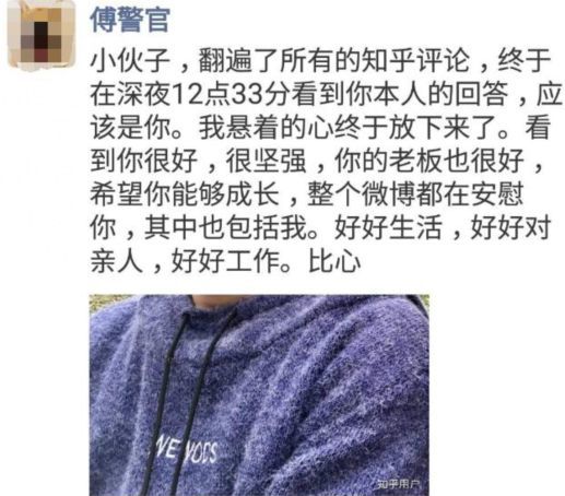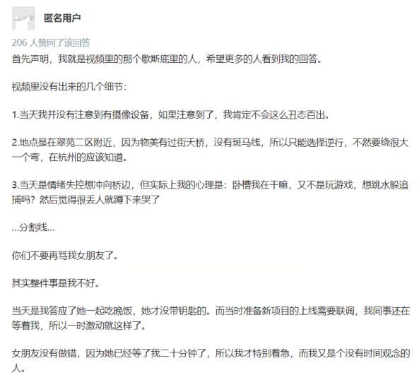 小伙知乎上发文回应 别骂我女友了 看到她哭我很难受 女友、老板、交警都挺好! 今天凌晨,一则疑似当事小伙本人的回应出现在了知乎上。文中,他对自己当时的行为作出了解释,并回答了网上的疑问,并感谢大家对自己的关心。 原文如下 首先声明,我就是视频里的那个歇斯底里的人。视频里没有出来的几个细节: 1、当天我并没有注意到有摄像设备,如果注意到了,我肯定不会这么丑态百出。 2、地点是在翠苑二区附近,因为物美有过街天桥,没有斑马线,所以选择了逆行,不然要绕很大一个弯。 3、当天是情绪失控想冲向桥边,但实际上我的心理是:XX我在干嘛,又不是玩游戏,想跳水躲追捕吗?然后觉得很丢人就蹲下来哭了 4、你们不要再骂我女朋友了,其实整件事是我不好。当天是我答应了她一起吃晚饭,她才没带钥匙的。而当时准备新项目的上线需要联调,我同事还在等着我,所以一时激动就这样了。 女朋友没有做错,因为她已经等了我二十分钟了,所以我才特别着急,而我又是个没有时间观念的人。昨天她看到很多骂她的,本来她还不在乎的,可是现在却哭成泪人了。她是我的开心果,生活中因为有她才不那么枯燥乏味… 5、老板也很好,我要请假随时都能请。但是,怎么可能…现在市场环境不好,老板为了让公司活下去自己也是成天成天的熬夜,同事也一样,虽然苦,但大家都一样…并不是谁的错。我会爆发,最重要的原因是因为我自己情绪控制能力弱。 6、说我是巨婴我也能接受,我确实心态上不成熟。但我从小家庭就教育我做一个正直的人,所以我才不会讲脏话,尽量不给别人添麻烦…但是我还是失去控制了。去年的时候我接受了一年的心理治疗,真是让医生失望了 又一次崩溃,我得反省我自己。我还是没有学会合理地释放压力,而且最近又缺乏运动。 7、我感谢交警的帮助,对不起给你们添麻烦了。 8、但我希望一切能到此为止,我女朋友一点都不女权,她是个很善良的人。 当天是我被抓了,然后我打电话给她,她当时很担心我,说过来接我,可是我不想让她看见我的丑态…所以打完电话后,我就哭了。 我的情绪控制能力不好,因为最近戒烟,如果当时能抽根烟的话或许脑子都能冷静下来了…我会继续强化这方面的练习,不会再给别人添乱了。 9、看见女朋友哭的样子,我很难过。希望你们不要再说她什么了…事实并不全是互联网上的那样。 10、我当时心情不好,压倒我的还有只狼里的剑圣… 心情不好的时候就想着连电脑都欺负我,而我又比较中二,就哭了出来。哭的时候突然就冷静了,觉得自己挺傻的。于是让交警大哥回去工作。 实际情况就是这样了…