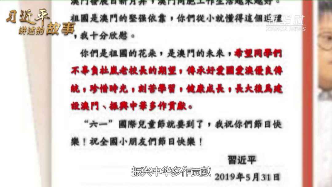鸿雁往还 尺素传情 这是澳门濠江中学附属英才学校的小学生给习近平主席写的信。新华社发 习近平对澳门的挂念,澳门人民看在眼里,记在心中。一封封写给总书记的信件,就是对习近平深情牵挂的回应。 2019年5月,澳门濠江中学附属英才学校的小朋友们给习爷爷写了一封信,讲述他们对“祖国母亲”含义的理解,表达长大后把祖国和澳门建设得更美好的决心。 对于孩子们从小就懂得祖国是澳门的坚强依靠,习近平倍感欣慰。他回信勉励道:“你们是祖国的花朵,是澳门的未来。希望同学们不辜负杜岚老校长的期望,传承好爱国爱澳优良传统,珍惜时光,刻苦学习,健康成长,长大后为建设澳门、振兴中华多作贡献。” 十年前,习近平考察澳门时曾到街坊总会亲切看望众街坊。十年时间,澳门发生沧桑巨变,老人们对习近平的挂念却一直没变。 今年适逢澳门回归20周年,老人们提笔给总书记写信,讲述了澳门回归后的发展变化,表达了深为自己是中国人而骄傲的心情、传承好爱国爱澳精神的决心。 习近平既为老人们退休后热心公益事业、生活充实快乐感到高兴,也勉励老人们坚持老有所为、继续发光发热,多向澳门青年讲一讲回归前后的故事,鼓励他们把爱国爱澳精神传承好,积极参与粤港澳大湾区建设,携手把澳门建设得更加美丽。 “你们说为自己是中国人感到由衷的骄傲,我相信这也是广大澳门同胞的心声。”在回信中,习近平肯定道。 “实现中华民族伟大复兴,港澳同胞大有可为,也必将带来香港、澳门发展新的辉煌。”在中华民族伟大复兴的进程中,澳门大有可为,习近平和澳门的故事也在不断延续…… 程瑶