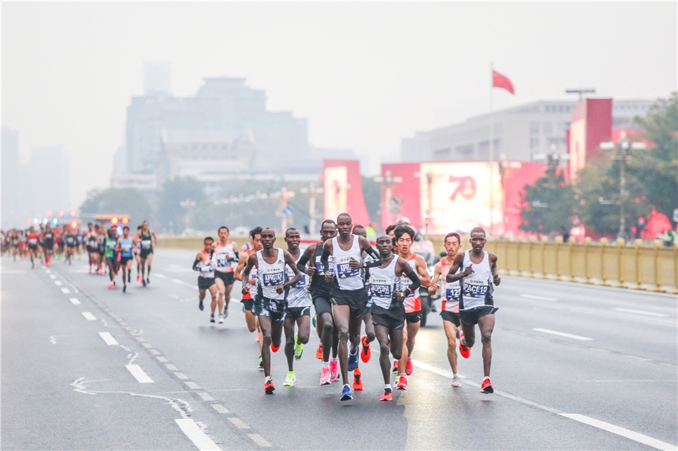 比赛在当地时间早上8点15分,北京时间14点15分开始。当时气温9摄氏度,降雨概率为0,风速是5公里/小时,只是湿度达到了90%。基普乔格与第一团队的七位配速员准时出发,配速团队是五人在前(第一排2人、第二排2人,第3排1人),两人在后,基普乔格位于第四排。