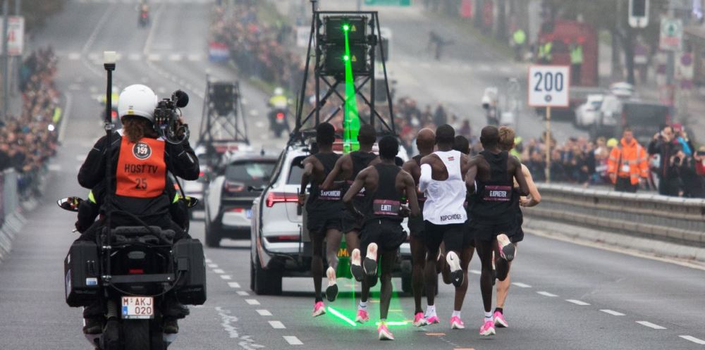 在完成3公里后,配速团队进行了交接,之后按照赛前计划每组七人的配速团队都会有序交接,有观众打趣这有点像是F1比赛中的进站,基普乔格作为“车手”始终都在,但轮胎却被及时更换。2012年田径亚青赛5000米亚军、日本选手村山紘太身处第四配速团队。另外引导车还一直打出一道绿色激光线“提醒”基普乔格以及配速团队。
