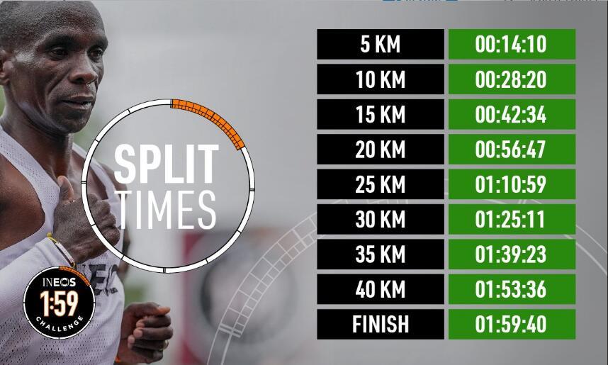 基普乔格的前5公里用时14分10秒,跑完10公里时用时28分20秒,前10公里用时比2017年在蒙扎时快了1秒。15公里过后,成绩是42分34秒;跑完20公里的用时是56分47秒,前半程结束的时间是59分35秒。