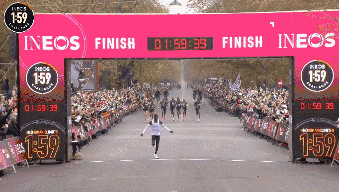 在自己的妻子和热情观众的欢呼声中,基普乔格自信的冲过终点线。在与妻子拥抱庆祝后,基普乔格接受了采访,“这证明了没有人知道极限在哪里,现在我已经做到了,我希望能够有更多人跟随我去冲击极限。我现在感觉很好,在罗杰-班尼斯特(英国著名赛跑运动员,1954年5月6日,班尼斯特在一次1英里跑比赛中以3分59秒4的成绩突破了4分大关,打破了长久以来人们心目中的人类极限。)创造历史后65年,我又去尝试,然后达成了目标。这证明了体育运动积极的一面,我想让跑步成为一种干净而又有趣的运动,当我们一起去跑时,我们就能创造一个美丽的世界。”