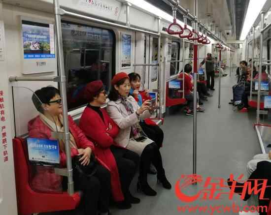 一群叔叔阿姨在车厢内自拍,阿姨们穿的很喜庆,喜悦的心情溢于言表,她们从天河公园坐到增长广场站,专门打卡新线。