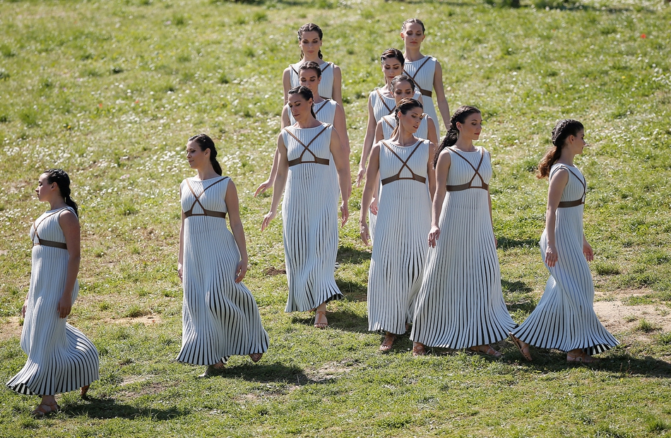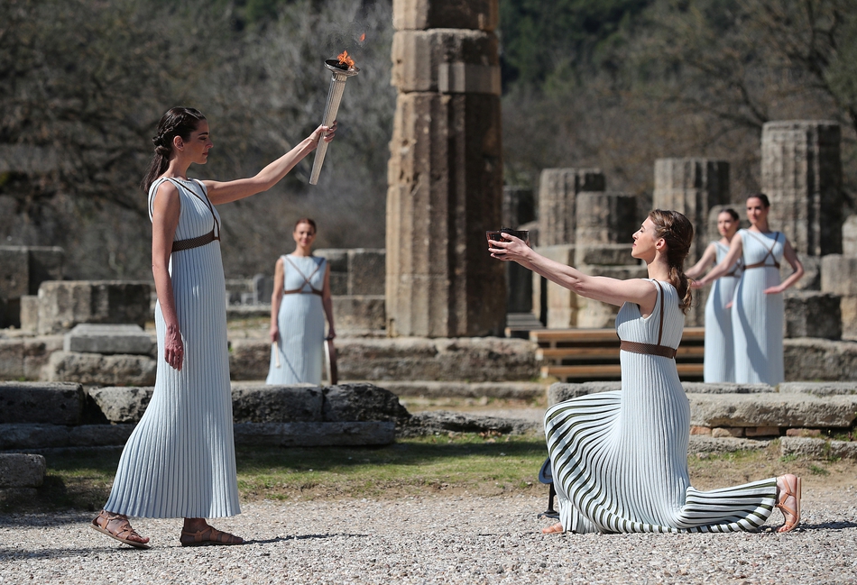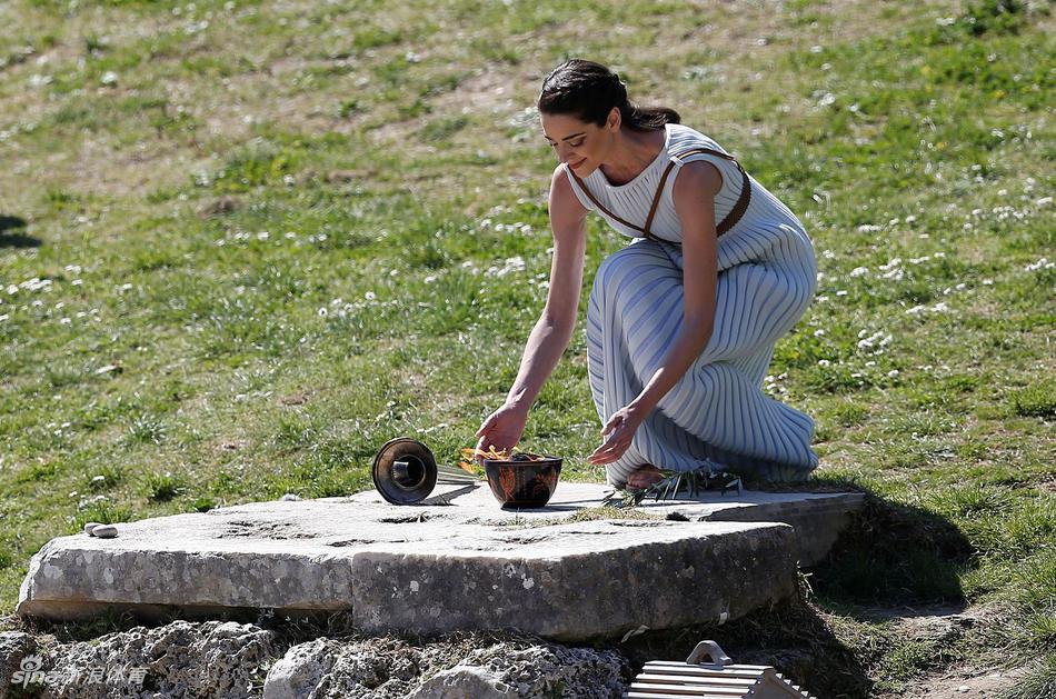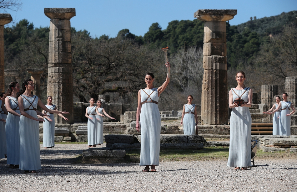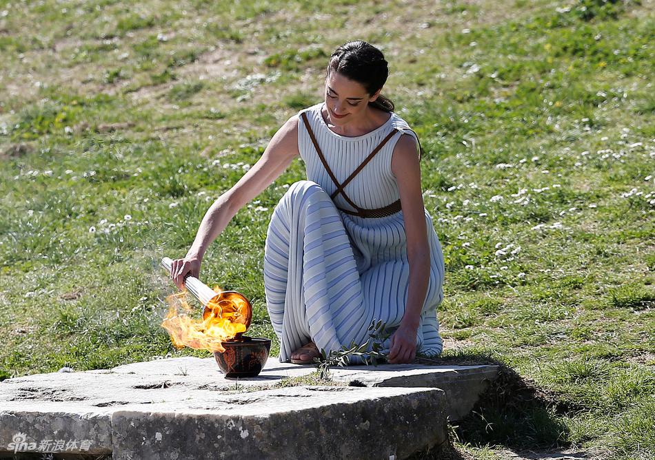2020年东京奥运会圣火采集仪式于北京时间3月12日下午17点30分,在希腊古奥林匹亚遗址举行。 由于受到新冠病毒肺炎疫情的影响,本次圣火采集仪式只面向国际奥委会、东京奥组委等100名相关人士开放,从而35年来首次在没有观众到场参加的情况下进行。同时,处于健康安全因素考虑,原本该由当地学生走位组成奥林匹克五环图案的环节也被取消,参与文艺表演环节的拉夫雷奥蒂基市青少年合唱团以及来自日本稻泽的18名高中生都缺席了此次活动;原本由孩童放飞和平鸽的环节也由“女祭司”来接替。 希腊总统帕夫洛普洛斯、国际奥委会主席巴赫、希腊奥委会主席卡普拉洛斯相伴入场,出席了圣火采集仪式。升旗仪式上,在奥林匹克颂歌的伴奏下,奥运五环旗帜率先升起;之后,日本国旗和希腊国旗也先后在两国国歌的伴奏下升起。 随后,希腊奥林匹亚市市长耶奥约普洛斯、东京奥组委特别代表远藤利明、国际奥委会主席巴赫、希腊奥委会主席卡普拉洛斯先后致辞。接着,嘉宾们穿过拱门,通向赫拉神庙参加采火仪式。在希腊神话里,赫拉为众神之神宙斯的妻子,掌管家庭、婚姻与生育。沿途,穿着橄榄绿色古希腊服装的男祭司,在小道旁边摆出各种运动项目的姿势。 一名女祭司以三击鼓的方式拉开了圣火采集仪式的序幕。身穿浅蓝色的女祭司们缓缓入场,最终,伴随着鹅卵石击打的声音,最高女祭司缓缓步入场中。在凹面聚焦镜前,她呼唤太阳神阿波罗,随即将火炬缓缓伸向凹面镜,在阳光反射下聚焦,火炬瞬间被点燃。最高女祭司用火炬点燃圣火盆,留取火种。在三击鼓后,35名女祭司重新汇聚成行,手捧圣火盆,沿着石子路,穿过拱门到达古奥林匹克竞技场。 今年最高女祭司的扮演者珊提-格奥尔吉乌是希腊著名演员。她毕业于雅典音乐学院戏剧学校,与历届圣火采集仪式上的最高女祭司一样,也是颜值高、气质好。值得一提的是,就在不到半年前的2019年9月17日,她还担任了2020年洛桑冬季青奥会圣火采集仪式的最高女祭司。另外,早在2008年,她还参与了北京奥运会圣火采集仪式的舞蹈文艺表演部分。 在一段由男、女祭司共同演出的现场舞蹈表演后,最高女祭司点燃了第一棒火炬。她左手手握橄榄枝,右手高举火炬,随后,她用手中的火炬点燃了第一棒火炬手手中的火炬,并将橄榄枝交给了她。