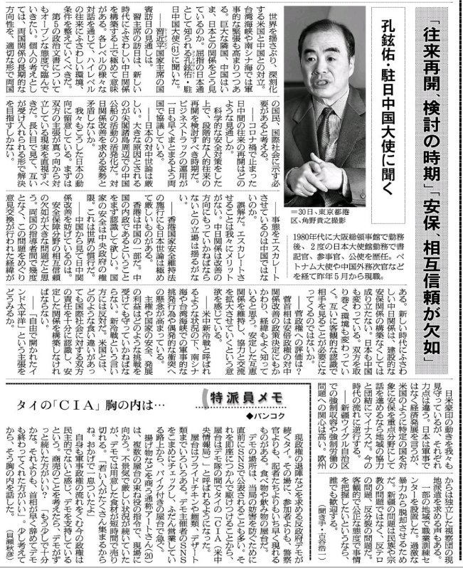 问:针对新冠疫情初期应对,美国和国际社会都有严厉声音。围绕当时的应对和病毒源头,中方是否会接受国际机构和专家的调查? 孔大使:新冠病毒是一种全新的病毒,发现和认知需要一个过程,这个过程至今仍未结束。中方就疫情得出初步结论后,第一时间向有关方面作了通报,体现了负责任的态度。中国的抗疫行动对全世界公开,经纬清清楚楚,事实数据一目了然。一些国家罔顾科学和事实,对中国进行无端攻击和抹黑,这种做法是毫无根据的。希望他们能把精力更多放到改进自身抗疫工作和维护本国人民生命健康上去,为国际抗疫合作发挥建设性作用。 新冠肺炎疫情发生以来,中国积极支持世卫组织发挥全球抗疫领导作用,同世卫组织开展了密切合作;深度参与疫情防控国际合作,尽己所能为国际社会抗击疫情提供了大力支持和帮助。今年7月,世卫组织专家来华开展新冠病毒溯源科研合作预备性磋商。不久前,习近平主席在第75届联合国大会一般性辩论上发表重要讲话,重申中国将积极参与病毒溯源和传播途径全球科学研究。病毒溯源是科学问题,不应将其政治化。中国将继续同世卫组织就此保持密切沟通协调,为全球病毒溯源和抗疫合作作出贡献。 问:关于新冠病毒的溯源调查,您提到中方正与世卫组织开展相关合作,目前有何具体进展? 孔大使:据我所知,双方就有关问题的沟通很顺畅。 问:王毅国务委员兼外长曾在两会记者会上表示,日本需要先治好自己的“心病”,理性看待和接受中国不断发展振兴的事实。我对此是认同的,同时日本真正客观理性看待中国发展似乎还有很长的路要走,您对此怎么看? 孔大使:关键是双方要坦诚相待,正视问题所在,同时展示相向而行的积极姿态并共同付诸努力。具体而言,就是要进一步深化经贸合作,拉紧利益纽带,同时以民众更能接受的方式开展民间交流,不断增进相互理解和信任。今后我们将继续以此为目标,积极同日本各界开展交流合作。 问:关于香港、新疆等问题,我们充分了解中方立场,也清楚相关问题历史经纬。在中方看来,这些问题是否影响了中方在国际社会的形象? 孔大使:我们处在一个复杂的国际环境之中,各国在历史、体制、传统等诸多方面都存在差异,这正是多元化世界的特征。令人遗憾的是,少数国家不懂得尊重世界多样性,仅凭体制差异,就对其他国家另眼相待,无法正视和接受不同于自己的国家。多样性是世界向前发展的动力源泉,中国也是这个多元世界的一部分。无论美国如何打压中国,甚至试图改变中国,都不可能得逞,中国不会变成美国,同时我们也无意改变美国。在当今国际关系中,试图改变一个国家的想法是落后于时代的,也是没有必要的。所谓香港、新疆问题,不过是美国等少数国家为打压中国而打造的政治工具。 中方坚决反对利用内政问题对中国进行打压。无论遇到怎样的挑战,我们都会坚决维护国家统一、安全和领土完整。一些国家借此对华施压,我们绝不会妥协退让。一些人受到相关报道影响,对中国产生这样那样的误解,中方愿与其冷静坦诚沟通,努力增信释疑。 问:日本外交正着力推进“自由开放的印太构想”,推动构建以秩序而非实力为主导的地区格局,中方对此有何看法?您是否认为印太构想会侵蚀日中军事安全领域的战略互信? 孔大使:对于日美印澳推动构建所谓“自由开放的印太构想”,中方一直保持高度关注。对于美国的想法,相信各方心知肚明。中方一贯反对针对特定国家、煽动地区对立、挑起零和博弈的做法。如果是针对特定国家,单纯搞封闭排他的小圈子,无疑损害地区和平、稳定和团结关系。希望各方把精力更多放在促进地区发展和繁荣上。