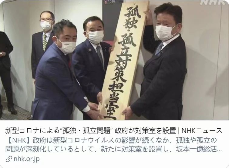 《纽约时报》分析,在日本隐忍的文化下,心理问题诉说的渠道本来就相对有限,新冠隔离下的社会孤立更是雪上加霜。在东京,约有五分之一的女性独居,必须要留在家里,无法探望家人。新冠封锁期间,女性的孤独感倍增。同时,还有一些女性对家务的分工不平等感到苦恼,疫情期间还出现了更多的家庭暴力和性侵犯的受害者。 一名大学刚毕业的日本女生萌绘接受新京报采访时表示,日本女性承受的家庭压力很大。她此前是一名志愿者,在一个机构里照顾摆脱了家庭暴力的女性和她们的子女。在新冠疫情的影响下,很多女性只能待在家里,家庭暴力的受害者更是没有了诉说的途径。 知名日本研究学者、广东外语外贸大学日语语言文化学院暨亚非语言文化学院院长陈多友分析,日本女性一直被赋予难以承负的重责。其实日本文化里并非是“武士道”的砍砍杀杀、大义名分的男性文化,而是讲求阴柔之美的女性文化占据主调。日语里有句话叫“女ならでは夜も明けぬ”(若无女人,永无黎明)。 而当今的女性普遍单身,甚至出现了自婚现象,这些女性在职场打拼,朝九晚五地与男性同工,却无法同酬。她们职业多为零售业、服务业,十分不稳定。疫情暴发后,女性比男性受到更大的冲击,她们的生活来源和社交圈子近乎崩溃,加剧了女性自杀事件的发生。 新冠疫情影响下,日本设立“孤独与孤立对策应对办公室”。/日本广播协会(NHK)电视台报道截图