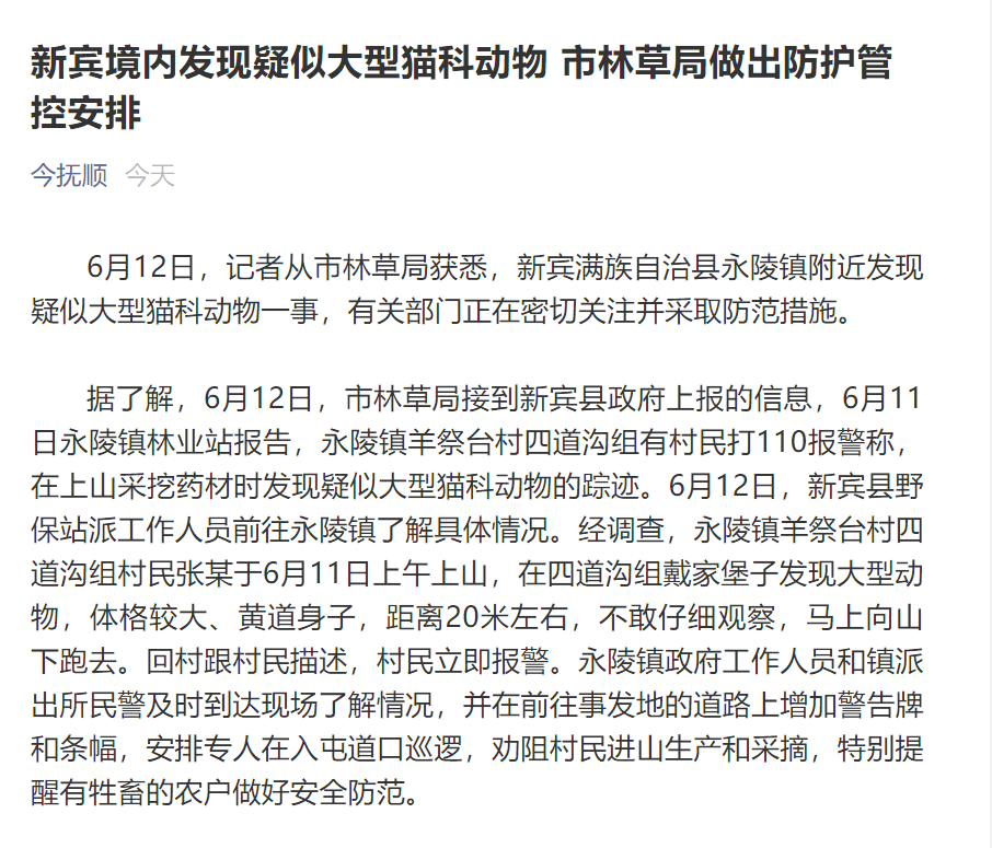 “目前,虽然没有报道老虎在乌林乡的具体位置,但我分析,如果是老虎,就是以前那只。”周海翔说,这只虎这么多年一直在当地活动,2010年前后还不止一只,但是后来就剩一只了。“据我所知,这只虎是距离中俄边境线最远的一只,也是唯一一只活动范围被高速公路分割、不与边境线连通的野生东北虎。” 此外,周海翔判断,这只老虎是“完达山一号”的可能性极小。“它跟‘完达山一号’不在一个区域,‘完达山一号’过来要跨过鹤大高速及镜泊湖的阻隔,这基本不可能。而且‘完达山一号’有卫星跟踪器,它若有靠近村屯的迹象,相关部门一定会事先通知村民,做出预警的。” 周海翔分析,从报道中看,有一只牛犊子被吃了后臀部,这符合老虎捕食猎物的特点。目前,当地还没有给出虎迹的具体尺寸,判断老虎最基本的数据就是量掌垫宽。“是否是老虎,还需要当地专家根据掌垫宽度来判定。” 世界动物保护协会科学家孙全辉博士也表示,东北虎是东北地区体型最大的猫科动物,其梅花状的脚印很容易识别并与其他动物区分。有经验的老虎专家甚至可以根据脚印的尺寸区分老虎的性别和大致年龄。但是,“仅通过视频的脚印,难以确认是东北虎,因为东北地区的猛兽有虎和豹,它们的脚印都是梅花状。但有能力袭击牛的恐怕只有老虎。”