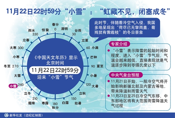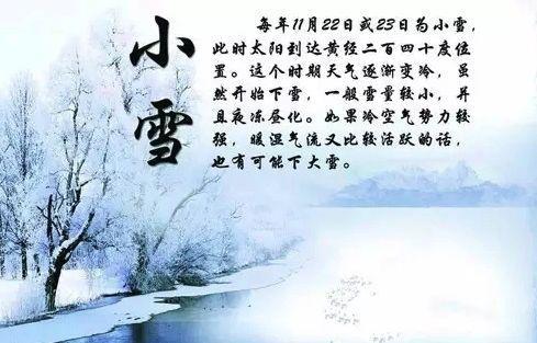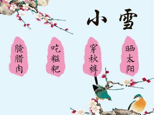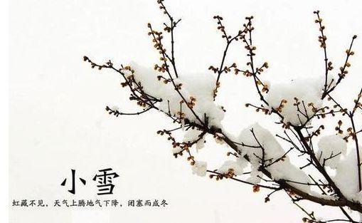 今天,迎来冬季第二个节气——小雪。太阳到达黄经240°,此时称为小雪节气。 此时,黄河以北地区会出现初雪。冬天就这样悄悄的降临了! 小雪·三候 虹藏不见 小雪之日“虹藏不见”。古人认为阴阳交才有虹,此时阴盛阳伏,雨水都凝成了阴雪,虹当然不见了。 天气上升地气下降 小雪后五日“天气上升地气下降”,天地各正其位,不交不通。 闭塞而成冬 再五日“闭塞而成冬”,冬为藏,冬为终。 小雪·习俗 腌腊肉 小雪过后气温急剧下降,天气也变得干燥,正是加工腊肉的好时候。所以,民间有:“冬腊风腌,蓄以御冬”的习俗,将多余的肉类用传统方法储备起来,等到春节时享受。 储蔬菜 俗话说“小雪铲白菜,大雪铲菠菜”。这时候地里的白菜该收割了。北方人家会把白菜腌制成酸菜、辣白菜,变成冬天餐桌上的另一道美味。 晒鱼干 小雪时台湾中南部海边的渔民们会开始晒鱼干、储存干粮。乌鱼群会在小雪前后来到台湾海峡,另外还有旗鱼、沙鱼等。 吃刨汤 小雪前后,土家族群众又开始了一年一度的“杀年猪,迎新年”民俗活动,给寒冷的冬天增添了热烈的气氛。吃“刨汤”,是土家族的风俗习惯;在“杀年猪,迎新年”民俗活动中,用热气尚存的上等新鲜猪肉,精心烹饪而成的美食称为“刨汤”。 小雪·谚语 小雪雪满天,来年必丰年。 小雪收葱,不收就空。萝卜白菜,收藏窖中。 立冬小雪,抓紧冬耕。 立冬下麦迟,小雪搞积肥。 立冬小雪北风寒,棉粮油料快收完。油菜定植麦续播,贮足饲料莫迟延。 小雪点青稻。 小雪满田红,大雪满田空。 小雪·诗词 小雪日观残菊有感 宋·方回 欲雪寻梅树,余霜殢菊枝。 每嫌开较晚,不道谢还迟。 早惯饥寒困,频禁盗贼危。 少陵情味在,时讽浣花诗。 初寒 宋·陆游 久雨重阳後,清寒小雪前。 拾薪椎髻仆,卖菜掘头船。 薄米全家粥,空床故物毡。 身犹付一歃,名字更须传? 小雪日戏题绝句 唐·张登 甲子徒推小雪天, 刺梧犹绿槿花然。 融和长养无时歇, 却是炎洲雨露偏。 和萧郎中小雪日作 唐·徐铉 征西府里日西斜, 独试新炉自煮茶。 篱菊尽来低覆水, 塞鸿飞去远连霞。 寂寥小雪闲中过, 斑驳轻霜鬓上加。 算得流年无奈处, 莫将诗句祝苍华。