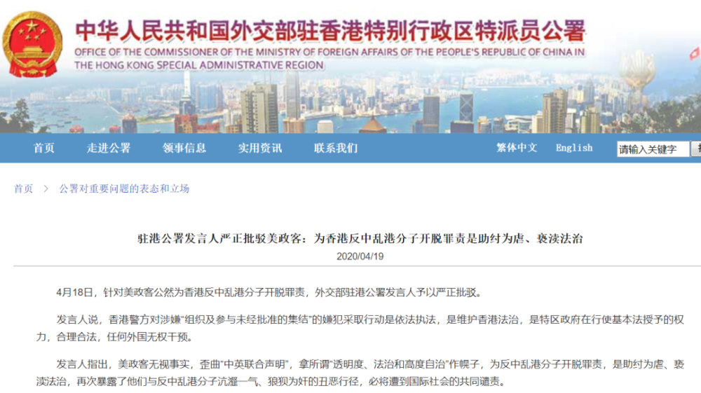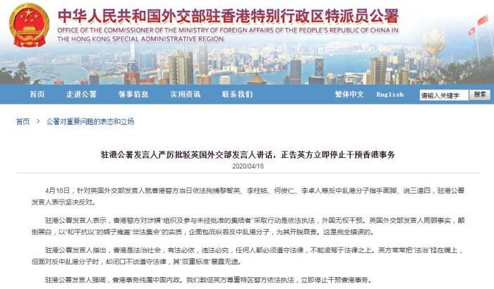 香港中联办:所谓“中央干预香港内部事务” 是对基本法的故意曲解