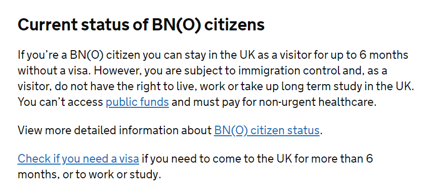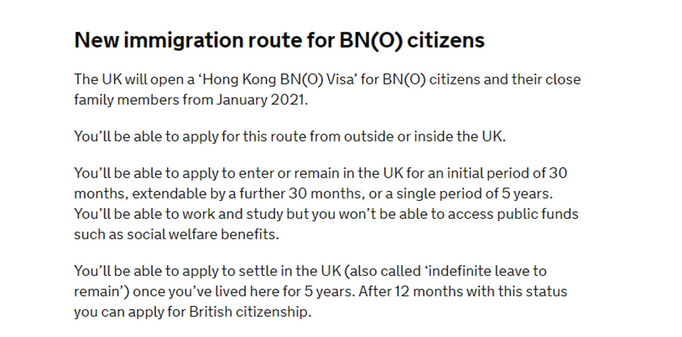 而在该特别签证生效前,按以往规定,BNO护照持有者仍可获得6个月免签入境英国的权利。因此,在正常情况下,尽管在6个月内不能工作和开展长期学业,这2位香港人仍有权入境英国。 截至目前,英国边检尚未对拒绝2人入境给出合理解释。而对于这2人来说,英国边检建议的“申请政治避难”也不是什么靠谱的路子,因为一旦以“政治避难”入境,按照规定,他们将不能在英国就业,其他居留权利也会受到影响。 第一位被拒入境的香港人,是在英国外交大臣宣布“BNO持有人可获特别签证”后,马上就飞到了英国伦敦。英国《每日邮报》按其自述披露了他和英国边检的对话: 英国边检:你无法入境英国,我们会将你送回本国。 被拒入境者:请你千万别这么做,请帮帮我,一旦回香港,我马上就有危险了。 这位被拒的港人还对边检说,如果他被遣返,香港政府会给他扣上“不忠”的罪名,甚至在落地香港就被逮捕。 相比第一位被拒入境的BNO护照持有者,从报道和自述看,第二位被拒者的描述更为夸张和戏剧化。 这位自称在香港从事IT行业的被拒者说,自己的祖父是国民党潜伏在香港的特务,给他的家庭留下了一些“不利于中共的秘密文件”,他是为了逃离危险跑来的英国。 而对于这些文件,这个被拒者表示,他曾将其发给过某些外国情报部门,但自从香港国安法落地后,他出于害怕已“将其副本全部销毁”,而且不会向任何个人展示这些文件。因此,报道也无法确认这些文件的存在以及内容。 目前,英国内政部关于BNO持有者入境要求的最新公告是,对于那些在“BNO持有者特别签证通道”开启前入境英国、却不符合移民要求的,只能取得居留权利大大受限的短期特许签证。 也就是说,假如在和英国有关部门沟通后,仍无法被安排正常入境的话,这2名持有BNO护照被拒入境的香港人,若想取得长期居留英国的签证,则需要先返回香港,待明年1月再设法重新入境英国。 只不过,假如第二位被拒入境者说的“向外国情报机构提供文件”属实,且文件内容确实触犯了相关法规,那么,等待他的,将是香港国安法的严厉制裁。 什么是英国BNO护照 英国国民(海外)护照(英文:British National (Overseas) Passport简称BN(O))是英国因应香港主权移交的问题,而在1987年7月1日起开始签发予香港居民中具有英国国民(海外)身份的护照。拥有英国国民(海外)身份的香港居民大约有344万,而持有这种护照的香港居民大约有150万。 当地时间7月22日,英国政府公布了有关英国海外公民护照(BNO)的扩权详情规定,称从明年1月起,持BNO港人可申请特别签证赴英居留,他们还可携带直系亲属,包括1997年7月1日后出生的子女。 根据英国政府官网消息,自2021年1月起,持BNO港人可以申请新的签证,赴英国居住最多5年,之后可申请定居。再居住12个月后可申请入籍。申请人可选择先申请到英国30个月(可再延长30个月),或是一次申请到英国5年。网站里列出了申请人要符合的6个条件,包括:1.申请人要证明自己的BNO持有人身份;2.通常居住在香港;3.财政上证明自己能在英国生活至少6个月;4.有学英文的意愿;5.取得由英国内政部认可医务所发出的结核病测试证书,以证明健康;6.需缴付签证费用与缴付健康税。