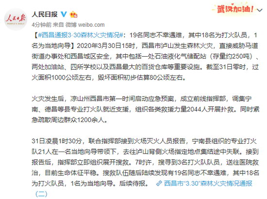 新华社成都3月31日电 记者从四川凉山州有关部门获悉,西昌突发森林火灾造成19人遇难,其中有18人是前来支援救火的宁南县森林草原专业扑火队员,1人是西昌当地带路的林场职工。据了解,31日凌晨一两点钟他们在赶往火场的路上,风向忽变,一行人被大火包围,不幸遇难。 另据西昌发布消息: 西昌市“3.30”森林火灾情况通报(二)