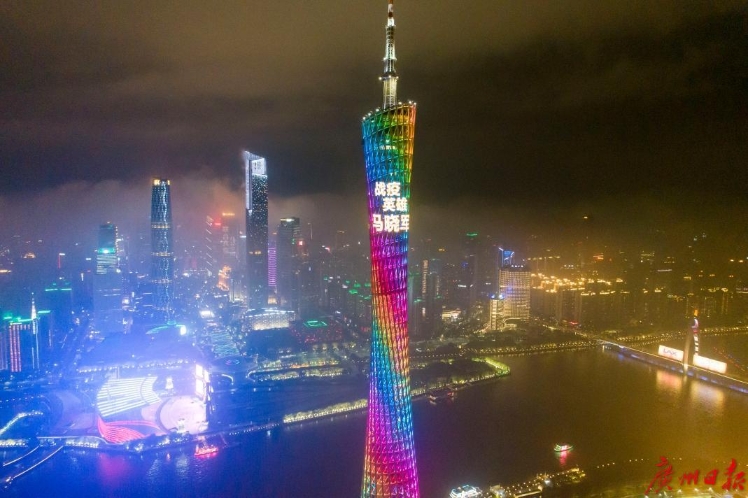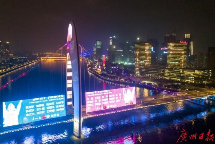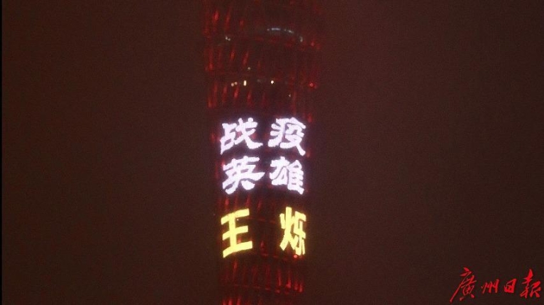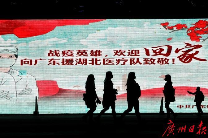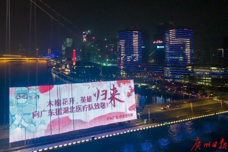 全城地标为英雄闪耀 3月20日起,由广州市委宣传部指导、广州日报发起的“你的名字,我们的荣光”致敬援鄂医护主题活动拉开帷幕。此次活动用致敬海报和分批播放队员名字的方式,向战“疫”归来的广东援湖北医疗队英雄致敬,传递万众同心的城市温度。 连日来,每当夜幕降临,广州塔、海心沙帆屏、猎德大桥、广报中心、花城广场、广州国际媒体港、北京路、流花展贸中心等地标大屏,都会依次闪出广东驰援湖北2484名医生护士的名字和照片,向战疫逆行者们致敬。一个个战疫英雄的名字、照片在各大地标建筑上闪耀,熠熠生辉。 日历翻回到1月24日,除夕夜,首批133名广东省援助湖北医疗队队员逆向而行出征湖北武汉,支援湖北省疫情救治工作。广东共派出26批次2484名医疗队员驰援湖北应对新冠肺炎疫情。自3月20日起,完成支援任务的“白衣战士”陆续回家,也自那一刻起,广州满城亮灯迎接英雄回家。 有人形容,这是盖世英雄们踏着彩云归来,也是父老乡亲给予“子弟兵”在返乡路上的最高礼遇——让我们认识他们的名字,也让我们看清口罩防护服后英雄的样子。 致敬活动的最后一晚,让我们再看一次英雄们的名字吧! 为了让市民和医护亲友不留遗憾,4月1日晚的北京路步行街健民医药大屏、流花展贸中心大屏、花城广场下沉广场大屏,滚动播放了2484名医护的全名单,以他们的名字彰显我们的共同荣光。