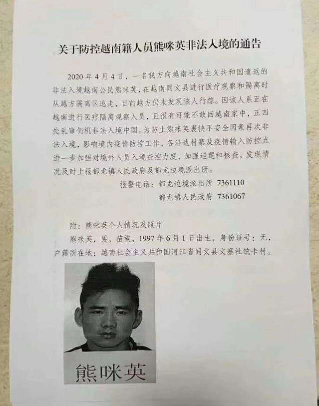 云南省文山州马关县都龙镇日前发布的一则“关于防控越南籍人员熊咪英非法入境”的通告,我国遣返的非法入境越南公民熊咪英,在越南同文县进行医疗观察和隔离时,从越南隔离区逃走,正伺机非法入境中国。 4月8日,都龙镇边境派出所工作人员在媒体上公开表示,熊咪英起初是在麻栗坡县非法入境后被发现,之后被遣返回越南,但隔离期间又逃跑。“目前接到越南警方的消息,并未在越南发现熊咪英。”