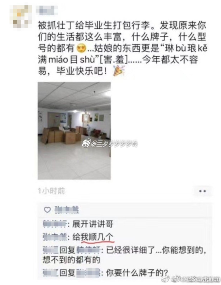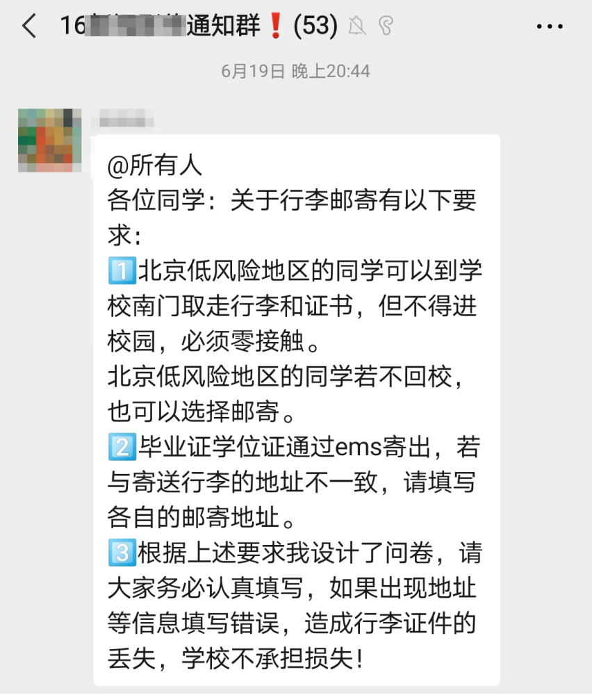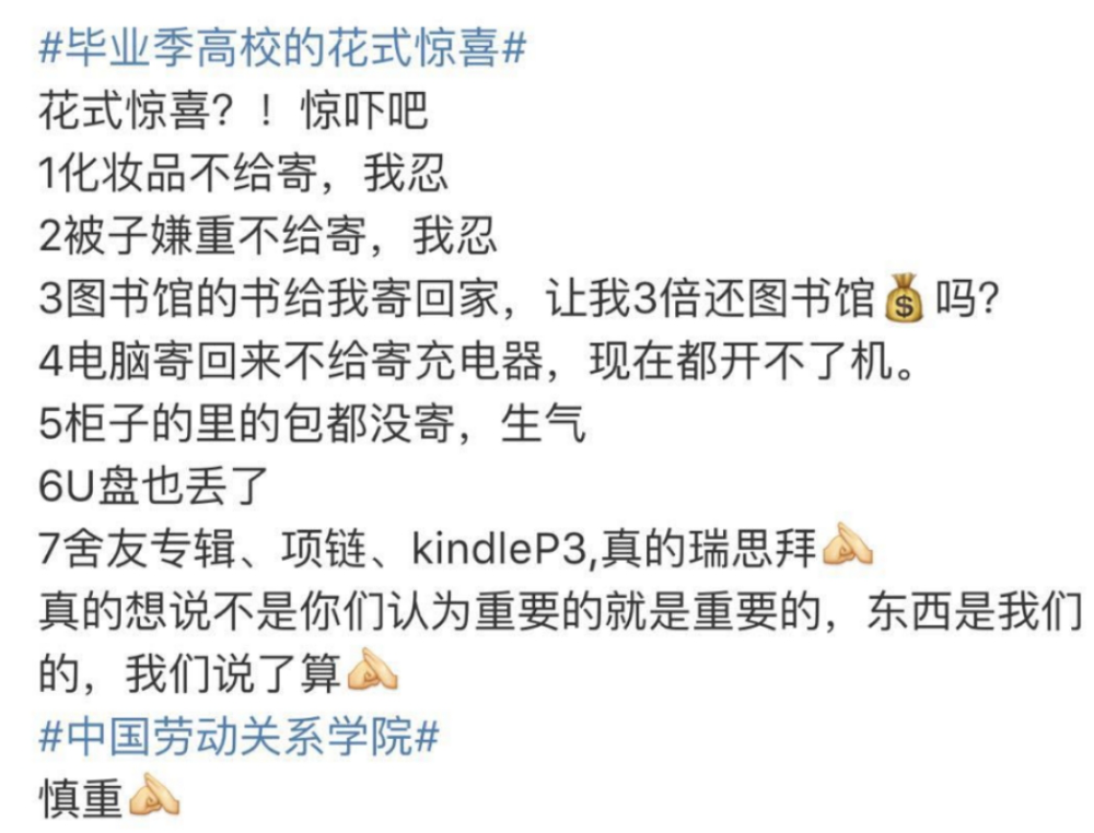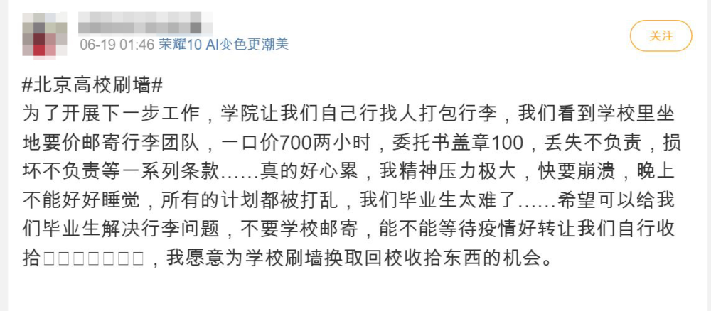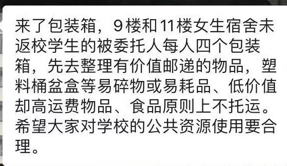 “别人都不想返校,只有我一个想回回不了。”陈术这才意识到,此前可能是与可爱夏装们距离最近的一次了,只有三层楼的距离,但她却错过了,这让她非常后悔。 “早知道那时候再麻烦,也要把我的衣服抢救出来。”之所以说“抢救”,是因为大连已经开始返潮,她担心衣服长久不用,或已经霉透,没救了。 进入6月,事态才开始好转。陈术所在专业终于凑出四五个本地同学和一名辅导员,负责打包全专业60多人的行李,其他院系的情况大致相同。 陈术能想象他们即将面临的辛苦,但比起寄希望于他人,她更想自己亲手打包行囊。为此,她找过几次老师,结果都不理想。好在,她最终得到学生办公室主任的帮助,向学校递交了返校申请,并获通过。 6月24日一早,陈术赶到学校。校园失去往日的热闹,除了前来开会的老师,毫无人气,只有一个门卫守着空荡荡的大门。 “你是谁?从哪里来?到哪里去?”门卫发出“灵魂三问”。 “学生;本地;拿行李,已报备。”门卫打电话一一核实,陈术终于被放进了校。 来到宿舍,宿管阿姨的盘查比以往更为严格。即使陈术提供的信息无误,也要等学生办公室主任陪同入内。 因为是特别申请提前返校的,整层宿舍只有陈术和老师两个人。往常拥挤的楼道空空荡荡,只有回声作响。推开门,宿舍还停留在上学期离开的时刻,只比以往多了些灰尘,“熟悉,但有些荒凉。” 大学四年,要带走的东西并不多,一些瓶瓶罐罐,还有陈术心心念念的夏装,所幸它们还没发霉。有老师帮忙,半小时就收拾完毕。而她的舍友,由于没留下什么贵重物品,加上还要运费自理,决定丢弃所有物品,不留一点念想。 离开时,陈术只带走一个背包,和一个纸箱。走出校门,她才意识到,自己彻底毕业了。 这个毕业季,被疫情搅得没有一点点氛围。 毕业典礼不了了之,陈术憧憬多年的校长拨穗化为泡影。所谓的“毕业晚会”,也改在腾讯会议上视频直播,除了主持人串场,学弟学妹在线祝福,屏幕上只剩空洞的流行视频,和一页又一页的ppt。只在老师开始低落地告别时,陈术回忆翻涌,难过地哭了出来。 疫情也将许多事置于不确定中。几天前,陈术收到北京的一份offer,老板说工作地点在顺义,疫情不严重,让她放心过来。但陈术发现,老板的朋友圈定位竟在内蒙,她不确定自己要不要接这份工作,更不知道疫情下的自己该何去何从。 “人算不如天算。”陈术感慨。她计划疫情结束后,再来看看老师,看看正常的校园,和学弟学妹的毕业典礼。 也有老师贴心打包,全程直播,一天寄回800份行李 听到其他学校的遭遇,徐小凤只觉得能在母校毕业“真是幸运”。尽管行李还在路上,她始终对学校的处理方式感到满意。 徐小凤来自北京一所市属高校,和其他高校一样,学校原本提供返校打包和委托邮寄两种方案,毕业生最早可在6月16日返校。可日子还没到,疫情先升级了,学校只能紧急叫停返校,并封闭了校门。 很快,学校又提出两种新方案:搬家公司将行李打包后,送至校门口,供北京低风险地区学生自取,或由学校出资,寄往京外。打包时,辅导员和宿管老师都要在场,并与学生保持视频沟通,以防物品遗失。 对于储湉、陈术等人的遭遇,徐小凤也有耳闻,但这个心大的姑娘并不担心事情会落在自己头上。一是因为她东西本就不多,也没贵重物品,此外,学校历来“靠谱”,承诺基本都能做到。 早在6月2日,学校就在通知中申明,将为毕业生退还部分住宿费,并为返校生提供核酸检测费和交通补助。与通知一同下发的,还有毕业生返校安排通知、安排解析、返校信息摸排问卷和告家长书等四份材料。这些安排让徐小凤很安心。 6月24日下午,徐小凤的宿舍开始打包。