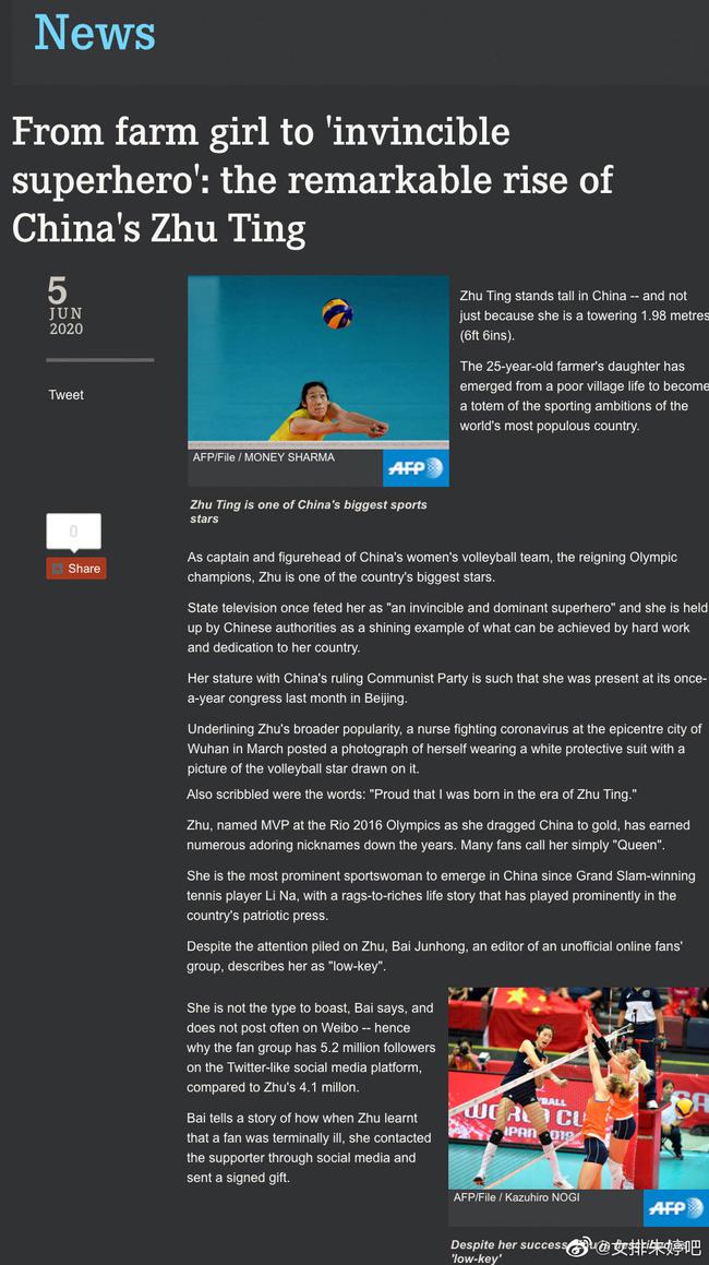 尽管卓有成就,但仍被描述为“低调” 六白说,朱婷不是那种自夸的人,她也不经常在微博等社交媒体上发帖,这就是为什么她的粉丝团的账号(在类似Twitter的社交媒体平台上)有520万关注者,而朱婷的微博粉丝为410万。(说的就是我们女排朱婷吧关注量520万了。。。) 六白述了一个故事,他说朱婷在听到她的一个粉丝患病后,通过支持者(对,就是我们)写了很长的文字鼓励这个粉丝,并赠送了签名礼物。 “朱婷是一个很好的榜样,她愿意学习,有勇气尝试任何事情,遇到困难时可以面对困难。” XX岁的六白说。 “祖国至上,团结,坚韧,勤奋,永不失败,是她对女排精神的完美诠释。” 家庭可以很贫穷 精神很富有 朱婷来自河南省中部的一个村庄,她的父母是农民,她是五个女儿之一。 她从小就长得很高,到13岁时,她已经超过175cm。 “当她还是个小女孩的时候,我们的家庭还很贫穷。”她的父亲朱安亮在里约奥运会结束后接受采访后告诉官方媒体,朱婷在里约热内卢获得了179分。 “现在我们的生活变好了,但是当朱婷回到村庄时,她仍然只是个来自普通农民家庭的普通农家女孩。” 朱婷的成功使整个家乡受益匪浅,当地政府为她们修建里水泥路。 据《环球时报》称,村民将这条路命名为“朱婷路”。 她叫朱婷 在将乡村生活换成一所国立体育学校后,年轻的朱婷刚开始还会找父母哭泣。2013年,她代表中国女排首次亮相。
