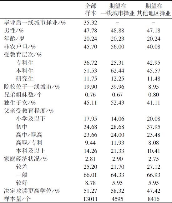 在另一个半球,逃离大城市的戏码同样在上演。《纽约邮报》统计发现,2010年至2017年离开纽约前往美国其他地方的人比其他地方去纽约的人高出近100万。在全球范围内,“逃离”大城市以追求更好生活品质的潮流同样在伦敦、芝加哥等大城市悄悄蔓延,并且逐渐呈现年轻化趋势:离开城市前往乡村的人群平均年龄相比10年前年轻了10岁。 已有研究显示,大学毕业生就业区域的改变主要源于外部因素(环境)和内部因素(心理)的改变。 在外部因素方面,城市间的收入差距、就业机会可获得性的差别、心理成本和短期的货币收入等都是影响大学毕业生就业区域的影响因素。同时,居高不下的房价也对毕业生的择业产生影响,虽然高昂房价使得毕业生希望前往薪资较高的大城市和岗位就业,但真正面对大城市的购房压力时,多数毕业生实际上辞掉一线城市的工作而选择在中小城市再就业。在心理因素上,随着互联网时代的到来,大学生在择业观上变得更加灵活,勇于尝试互联网催生的各种职业,并着重于自我价值的实现和自我能力的发展。 不过,在宏观环境和微观因素一同改变的情况下,近年来大学生的预期就业地点产生了何种变化仍未明朗。有报道称,2013年高校毕业生中,有61%主动逃离北上广深一线城市而前往二三线城市工作生活,但也有报道称该数据结果为“伪命题”。因权威数据缺失,全社会难免对大学生的预期就业走势缺乏了解,这会影响或推迟政府相关政策的形成。 本研究尝试使用2013年、2015年和2017年权威调查数据,重点揭示近年来大学生预期就业城市偏好的趋势,并探讨哪些大学生群体倾向于前往一线城市进行就业。