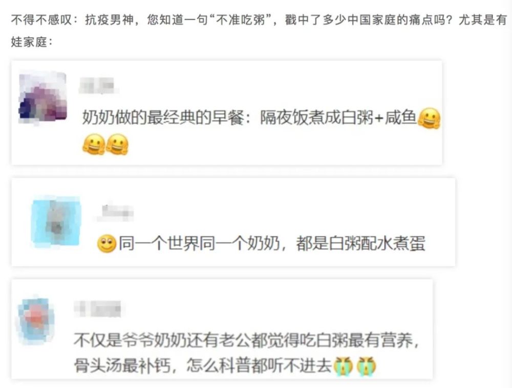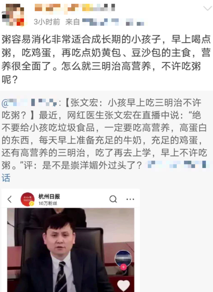 在他们看来,牛奶、三明治是西式食品,粥是典型的中式食物,所以,提倡喝牛奶、不主张吃粥,因此轻易地跟媚外挂上了钩。 不得不说,这番逻辑太跳跃。 这里面,有些基于专业性的质疑确实可以探讨,比如,粥若加入其他合适成分,也可以提升营养。 但扣上××形态的大帽子,就是不讲理了。 看待科学话语时,别被非科学话语带偏了 需要注意的是,张文宏说这段话的语境,是在疫情大前提之下。他的这段话,时间上是“这段时间”,对象是“中国的孩子”,且限定词是“早餐”。 如此这么一捋,张文宏医生的意思大致就是,当下是非常时期,孩子们尤其需要补充营养,增强抵抗力,所以早餐要吃好,那就多吃鸡蛋、牛奶,不要只喝粥了。 他此话一出,相应的养生、健康、育儿类的文章像雨后春笋般纷纷冒出,来介绍、科普怎样的早餐才是有营养的,如何为儿童成长发育调整饮食结构等,这本是好事。 张文宏的话引发质疑,也无可厚非,毕竟有很多人是“喝粥长大的”,对“粥养人”的认知就跟“喝骨头汤补钙”那样,也算是根深蒂固。扭转他们的想法,终究要个过程。 舆论场中,还不乏有些人喜欢钻牛角尖,好硬刚硬怼进行质疑,想要从学术层面,论下牛奶营养价值几何、与粥相比如何,这也拦不住。 这也表明,从学术研究的结论发展到常识,让人广泛接受,还有很长的路要走。 但应有的共识是,对专业结论该用专业视角分析,不能动辄上纲上线——那样只能是伤害专业化表达,也损害正常的表达环境。 动辄带偏节奏,那就不对了。还有“别人在一线抗疫,他在网上胡说八道”,更是歪曲事实,抹杀张文宏医生在抗疫上的付出。 疫情期间,张文宏医生因为“耿直”、“敢言”一蹿而红。他的金句广为流传,他的言语建议与谆谆教诲,也让很多人奉如圭臬。 但誉满天下,谤亦随之,在网上,有些攻击、猜忌甚至不怀好意的恶意解读也伴随而至。 如果说,无凭无据的“张文宏医生年薪180万”传言,可能还是出于好奇,那“好事之人”对张文宏医生的专业意见上升到“贬斥文化习惯”的层面,就不啻为坏了。 稍有理性者,都不该被这类“夹枪带棒”的恶意解读混淆科学话语,带偏了节奏。 毕竟,让科学回归科学才是硬道理,“诛心”先行,只能是与“科学”“理性”背道而驰。 文 | 狄宣亚(媒体人)