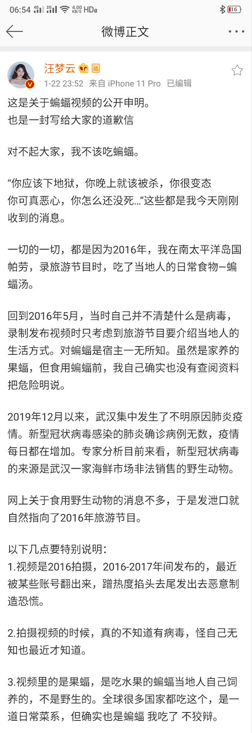 视频显示,在一家餐馆内,两名出镜女主持人面前均摆放一碗蝙蝠汤。一名女主持人从汤中将黑色的蝙蝠捞出,举在手中,对着镜头向观众介绍该蝙蝠的种类与外表;随后,两名女主持人各自将碗中的蝙蝠从中撕开,并亲口品尝,然后叹道“这肉很紧,但很香”。 1月23日,中国科学院武汉病毒研究所石正丽团队发布最新研究成果:武汉新型冠状病毒在整个基因组水平上与蝙蝠冠状病毒的同源性为96%,这意味着新型冠状病毒很可能来源于蝙蝠。 公开资料显示,尼帕、亨德拉、埃博拉、马尔堡、SARS,这些危险的病毒的自然宿主都是蝙蝠。因此女主持人汪梦云食用蝙蝠的视频遭到众多网友的攻击。 “你真恶心”“你很变态”……在收到多个回复后,1月22日23时52分,汪梦云在个人微博上发表一条公开申明,称自己当时是在帕劳录制旅游节目,并不清楚什么是病毒,也对蝙蝠是宿主一无所知,只考虑到节目需要介绍当地人的生活方式。同时,她也声称视频中所食用的蝙蝠是果蝠,为当地人饲养的吃水果类蝙蝠,非野生,是一道日常菜系。最后,汪梦云表示为自己曾经的无知道歉,并称从现在做起,从自己做起,以身作则此生拒绝吃野生动物。