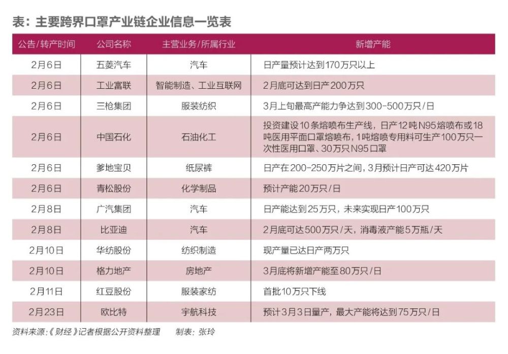 核心原材料产能待缓解 “目前熔喷布供应缺口大,是因为此前行业比较窄,用量突然增大。”山东俊富无纺布有限公司一位内部人士告诉《财经》记者。 据悉,该公司是目前国内最大熔喷布生产商,其每日产量为15吨。公司目前拥有7条熔喷生产线、4条防粘生产线等。其熔喷布细菌阻隔率都达到95%以上,均符合医用级别。 面对口罩核心原材料紧缺的局面,央企中国石化跨界介入。2月24日,中国石化党组决定,利用自有原料生产优势,建设10条熔喷布生产线。 据了解,中国石化此次将投资约2亿元,在北京燕山石化和江苏仪征化纤两家企业抓紧建设熔喷无纺布(即熔喷布)、纺粘布生产线。 其中,北京燕山石化将建设2条熔喷布生产线和3条纺粘布生产线,力争在3月8日前实现熔喷布部分投产。仪征化纤将建设8条熔喷布生产线,将于4月中旬陆续建成投产。全部投产后,每日可生产12吨N95熔喷布,或生产医用平面口罩原料18吨。这些原料如果用于生产医用平面口罩,每日产量可达1800万只。 “建设熔喷布生产线,如果按照正常流程,可能需要两年,现在十几天就落实了。”中国石化一位内部人士在接受《财经》记者采访时表示,“目前公司员工都在加班加点工作,燕山石化的同事已经忙得不可开交。” 中国石化生产的熔喷布将如何定价?“目前我们尚未定价,一个可能的定价方式为,按照国家采购口罩的价格倒推熔喷布的价格。”前述中国石化内部人士表示,“这有望在一定程度上抑制国内熔喷布的炒作。” 在熔喷布集采微信群中,有口罩厂商开始企盼,中国石化的熔喷布投产后,熔喷布价格不再继续疯涨。 作为两桶油之一的中国石油,在加快生产熔喷布原料聚丙烯医用料的同时,组织炼化生产企业、化工销售单位、科研院所及合作伙伴,合作生产熔喷布。3月份熔喷布合作产能,将达到7吨/天。 除了此前国内产能低导致熔喷布短缺,熔喷布生产设备量产周期长、生产线价格较高,也成为制约其产量的重要因素。 “正常情况下,1条生产线的周期,从购买到量产需要两个月时间。”青岛塔克净化技术公司的销售人员对《财经》记者表示,该公司是国内一家熔喷布生产设备厂家,据其介绍,目前公司熔喷无纺布生产设备的订单比较多。 在熔喷布集采微信群中,也有供应商在分析原因,熔喷布生产设备的熔喷头主要来自德国,目前国内对熔喷头的订单,可能要4月初才能交货。 “我们的熔喷布生产线能够快速上线,得益于公司旗下易派客和客户的对接。”前述中国石化内部人士表示,“易派客是中国石化旗下工业品电商平台,具备采购和销售功能。通过这几年的努力,易派客在供应链整合方面积累了一定资源。” 据其介绍,在疫情暴发初期,公司通过易派客平台从海外紧急寻找货源,锁定了40吨熔喷布。目前这些货源大部分已对接给急需的企业。 熔喷布生产线高昂的价格也让一些中小企业望洋兴叹。 “据我了解,一条熔喷布生产线投产成本约千万元级别。”张强告诉《财经》记者,公司此前生产无纺防护,在原有的设备基础上,通过购买核心配件,改装成熔喷无纺布生产设备。 “公司熔喷布设备产品宽幅分别为1600mm、2400mm、3200mm,年最大产量分别为600吨、800吨、1000吨。”一位熔喷布生产企业人员对《财经》记者分析,其中年产1000吨平均日产能约2.74吨,但该设备价格近千万元,非一般规模企业所能承受。 按照中国石化此次投资2亿元,建成10条熔喷布生产线和3条纺粘布生产线计算,每条熔喷布生产线的价格也在2000万元左右。 多公司跨界支援 面对“一罩难求”的紧张局面,不少企业纷纷“跨界”生产,“改行”做起了口罩。其中不仅有比亚迪、上汽通用五菱、富士康等大型制造企业,爹地宝贝、三枪内衣等纸尿裤、服装生产企业,甚至还有地产、卫星这类完全“不沾边”的公司。 企查查数据显示,自2020年1月1日至2月27日,全国范围内医疗器械新增企业超3万家。 2月6日下午,富士康在公众号上发文称,集团旗下工业富联(601138.SH)近日在集团龙华园区首次导入口罩生产线,2月5日顺利实现试产,相关产能预计在2月底可达到日产200万只。口罩优先用于富士康近百万员工内部生产防疫保障,未来视情况积极对外支援输出。至2月17日,累计交货100万只。 在富士康发文生产口罩的当天,中国石油启动大庆石化、抚顺石化、兰州石化和大庆油田三地四家企业的口罩生产线建设。截至2月29日,4家企业新建6条医用口罩生产线开始满负荷加工生产,口罩日产能60万只。进入3月,随着引进的21条口罩生产线陆续开工,中国石油日产口罩可达150万只。 2月13日,上汽通用五菱汽车(以下简称“五菱”)生产的第一批20万只口罩已批量出货。7天前,公司称,联合供应商共同改造无尘车间进行口罩生产,日产量预计达到170万只以上。14日,五菱已生产下线的前100万只“五菱口罩”正式交付。 此外,比亚迪、广汽集团等车企也通过自建或联合供应商转战口罩生产。比亚迪2月8日在其官微宣布,调配资源,援产口罩和消毒液,口罩产能本月底可达500万只/天,直至疫情缓解和消除。“主要供给一线疫区、医院以及抗病毒相关部门,产能多余后会以平价对外销售。” 与车企“跨界”相比,纸尿裤、内衣厂家的转产更是水到渠成。爹地宝贝、三枪内衣、红豆服饰、水星家纺等一批商家纷纷改变原定生产计划,转产口罩和防护服。 其中,以生产婴儿