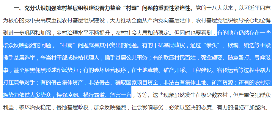 这次会议提到,要总结吸收党的十八大以来扫黑除恶专项斗争整治“村霸”等突出问题的成功经验和有效做法。“严格落实各级党委特别是县乡党委全面从严治党的主体责任,从组织上推动形成防范和整治‘村霸’问题长效机制,为全面推进乡村振兴创造安全稳定的社会环境。”
