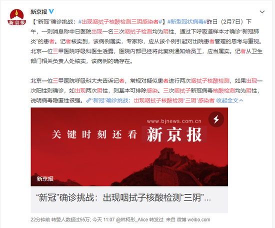 此外,医护人员采样时的操作,对取样部位的把握和咽拭子擦拭的轻重,以及试剂盒的保管是否得当(要在零下20摄氏度的低温下储存和运输,但仅少数有冷链能力的物流企业可以承运)、试剂盒检测的实验室标准等,都会影响到检测结果,造成假阴性。 对疑似患者,不能因检测“阴性”就排除 因此,出现“假阴性”并不意味着试剂有问题,对此无需过度担心。在今天国务院联防联控机制新闻发布会上,国家药监局相关负责人也表示,经过严格的审批程序。核酸检测试剂产品性能能够达到技术要求的规定,产品安全性有效性和质量可靠性可以得到保障。 但是“假阴性”患者的出现,也让我们看到了病毒的狡猾和隐匿性,对此不可掉以轻心。对于疑似患者,一次至三次检测都是阴性,也不能轻易就下结论,还要结合流行病学、临床症状的标准来判断。同时,现在卫健委又增加了一个标准,即影像学CT的标准,但这只是局限于湖北,并且称为临床诊断病例,可以等同于确诊病例。 对于其他地方而言,患者相对较少,在检测压力并不突出的背景下,建议增加检测的次数,并结合临床症状,宁可保守些,不轻易排除,避免漏掉“假阴性真阳性”的患者。 同时,我们也需要进一步提高RT-PCR检测时提取样本和检测的技术水平,改进CT影像诊断的客观标准,这个工作其实在未来也可交由人工智能(AI)通过深度学习来完成,让新技术成为我们对抗病毒的有力武器。 □张田勘(专栏作者)