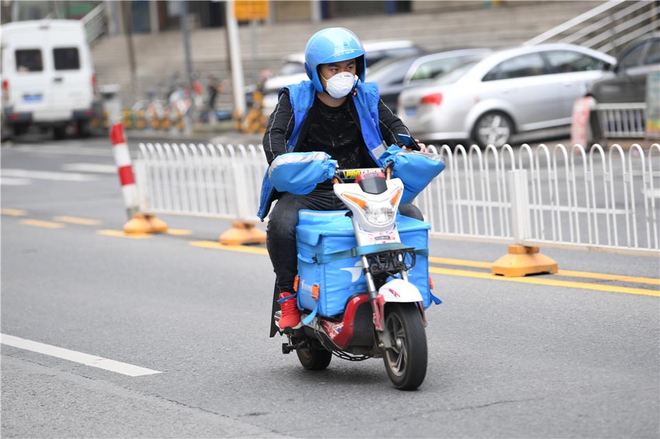 3月21日,湖北省武汉市洪山区虎泉街,快递员在送快递。