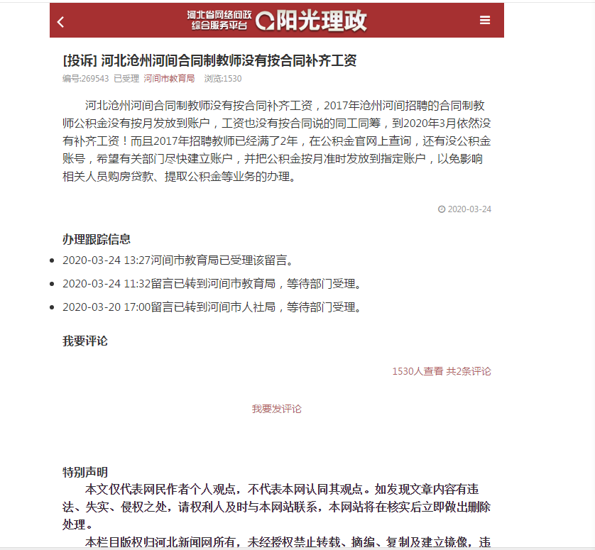 编号为269543的投诉文提到,“河北沧州河间合同制教师没有按合同补齐工资,2017年沧州河间招聘的合同制教师公积金没有按月发放到账户,工资也没有按合同说的同工同筹,到2020年3月依然没有补齐工资!” 投诉文中还提及,2017年招聘的教师已经满了两年,在公积金官网上查询,还有没公积金账号。投诉文中,网友希望有关部门尽快建立账户,并把公积金按月准时发放到指定账户,以免影响相关人员购房贷款、提取公积金等业务的办理。 办理跟踪信息显示,该投诉文经过两次转让,3月24日河间市教育局已受理该留言。 澎湃新闻在河间市政府官网查阅发现,《2017年公开招聘合同制教师公告》提及,聘用合同制教师第一年为试用期,工资1800 /月、第二年2100元/月。二年合同期满,从第二个聘期开始参照单位事业人员执行档案工资,享受养老保险、医疗保险、失业保险、工伤保险、生育保险和住房公积金,享受绩效工资、取暖费、独生子女费、乡镇工作补贴(在乡镇中小学、幼儿园工作)。