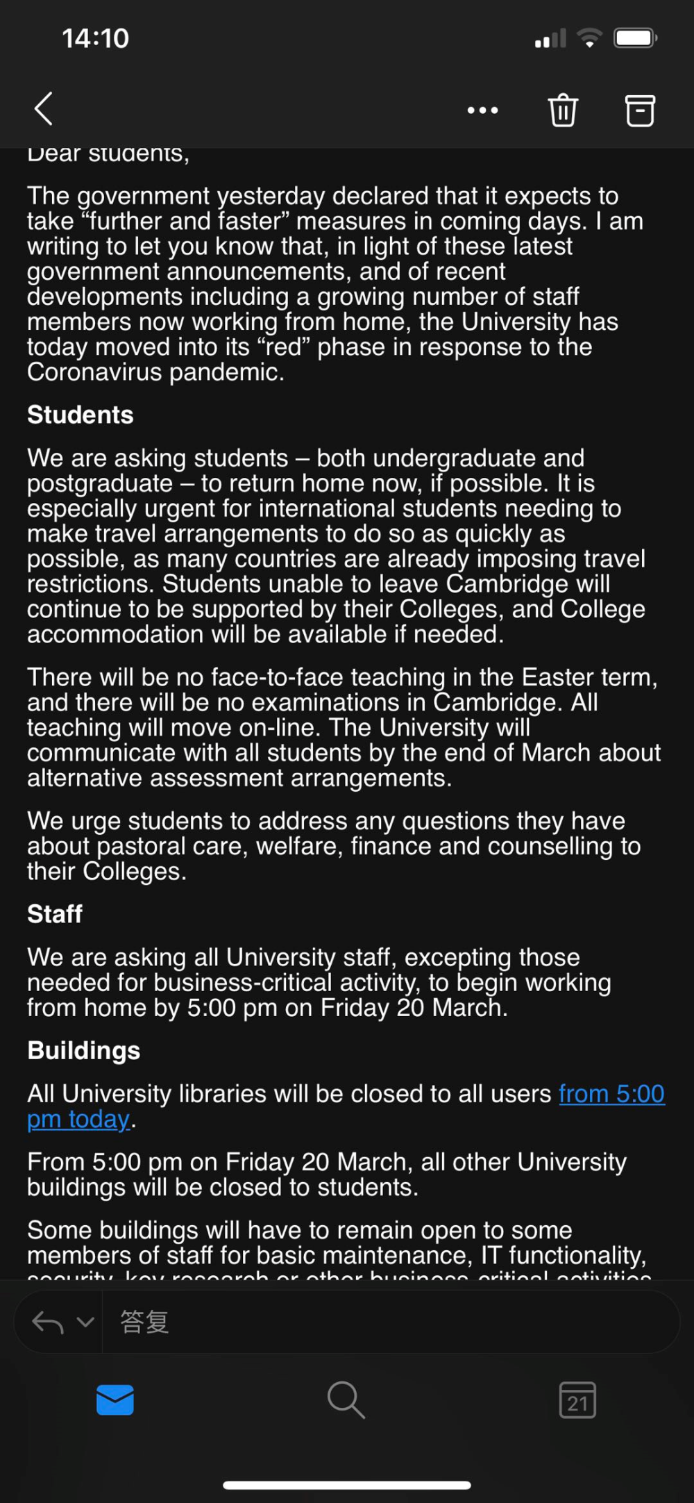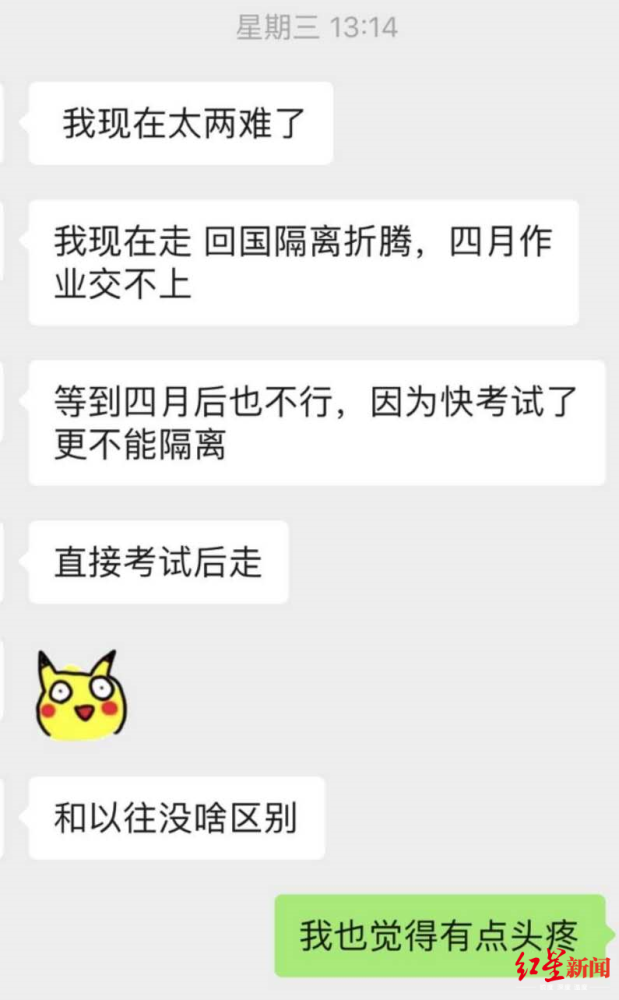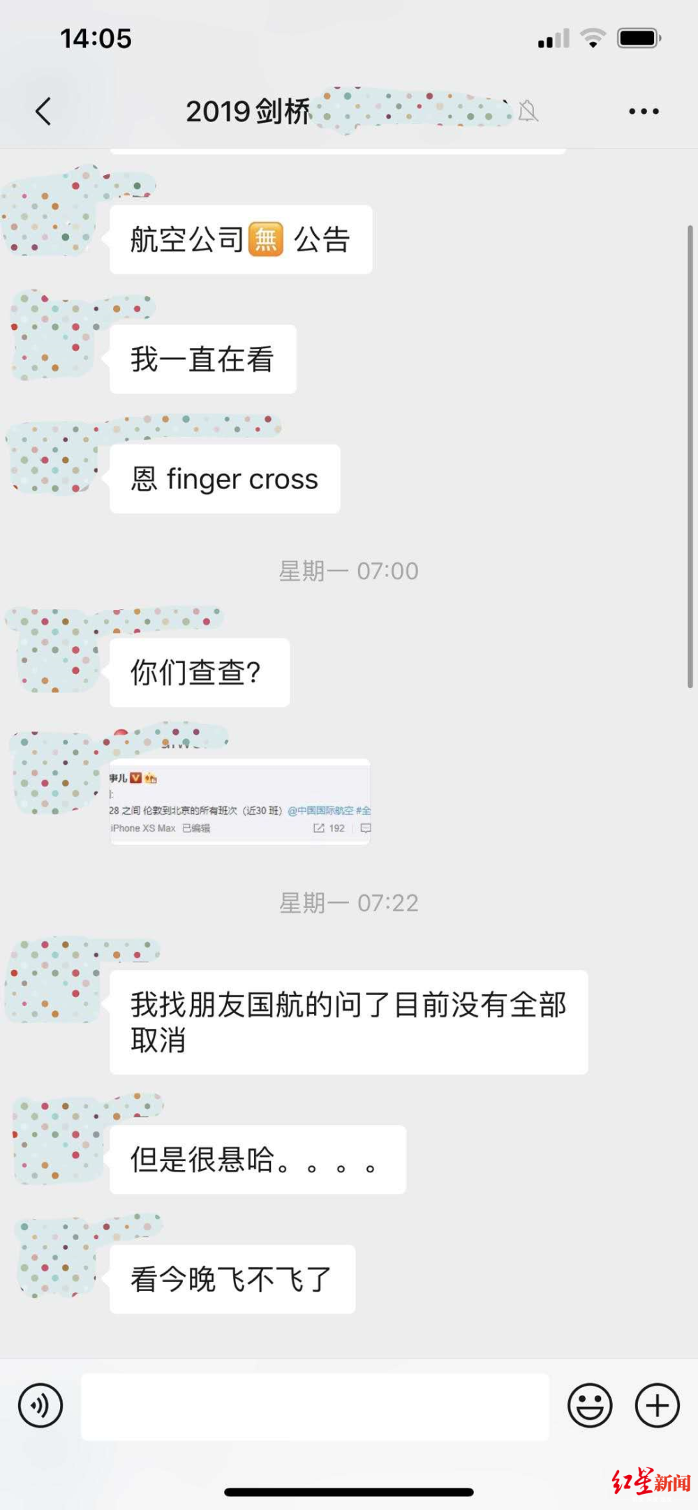停课,抢票 高女士和先生一直密切关注着法国疫情,家长们在群里也有很多交流,“孩子最开始说要回来,我们没有马上同意,那时还没有宣布停课,也担心孩子的考虑不周全,对后面的学习有影响。” “新冠疫情中国打上场,海外打下半场,海外华人打全场”,这是网上流传甚广的一个段子。 打满全场的,还有为子女安全担忧的中国留学生家长。 回,还是不回,左思右想,进退皆忧。纠结中下不了决心的家长,组成了留学生妈妈口罩群、包机群、学校群、区域群、留守群…… 2020年3月11日,世界卫生组织总干事谭德塞宣布,世卫组织评估认为新冠肺炎已具有“大流行”特征,海外新冠肺炎确诊人数跳增,有的父母来不及跟孩子商量,就帮孩子订好了回国的机票。 法国当地时间3月12日晚上8点,法国总统马克龙发表电视讲话,宣布法国所有学校从下周一停课。小金和楚楚所在的当地留学生群一下子炸开了锅,很多观望中的人迅速买了机票,订票软件上的价格翻了一番,“我马上把这个消息告诉父母,但感觉爸爸还在犹豫。我知道回国的道路必将困难重重,国内也不是所有人都欢迎我们回家,但是只有这片土地,才能让我感到踏实和安心。” 同班同学在宣布停课第二天醒来就收到了家人买好的机票,小金说虽然知道父母考虑得更多,但自己的情绪在那两天还是有些失控。 3月15日下午,群里传来即将封锁东大区和大巴黎的消息,“我意识到如果再不回去,就不知道什么时候才能走了。” 正在此时,楚楚找到她,问她“走不走”。楚楚此前因为担心回国会错过期末考试而选择了留守,接到学校取消考试的通知后,她跟家人快速作了回国的决定。 小金火速打开订票软件,独自在外打拼的阅历和敏感让她和师姐没有选巴黎作为出发地,“一是价格太贵,二是人太多风险高,三是可能封城,我们选了距离我们一个半小时的卢森堡大公国。” 她和楚楚商量一番,选了3月18日的票,因为想得到妈妈的首肯,稍微犹豫了一下,再回去看票,6000元人民币的已经卖完了,“只剩下7300的,妈妈马上给我转钱,付款成功那一刻,我心里的大石头终于落地,抑制不住心里的狂喜,半夜1点激动得叫了起来。” 小金和楚楚没有想到,她们当时在尽量减少转乘和价格可接受中平衡考量而选中的3月18日,竟会那么特别。这一天,是中国作为抗疫第一战场取得重大胜利的转折点,也是欧洲第二战场进入关键期的开始。 3月19日,据国家卫健委通报,3月18日0-24时,31个省(自治区、直辖市)和新疆生产建设兵团报告新增确诊病例34例。湖北、武汉新增确诊均为0。34例均为境外输入确诊病例(北京21例,广东9例,上海2例,黑龙江1例,浙江1例)。这是国家卫健委自1月21日起通报每日疫情以来,本土新增确诊病例首次为零。 3月18日晚上,英国首相鲍里斯·约翰逊在当晚的新冠疫情发布会上宣布,从当周五开始,除了少数关键岗位防疫一线人员、医护人员的子女和一些弱势群体儿童等可以继续上学外,英格兰的所有学校和幼儿园等教育机构全部停课,5月和6月的升学考试也被取消。 在欧洲出现“医疗挤兑”前,飞往中国的航班先出现了“航班挤兑”,机票价格陡涨,直航早已一票难求,转机则全凭运气。然而平时几千块、现在动辄上万的机票价格也不能保证留学生可以顺利返回。 小金的好朋友原本买了3月29日从英国飞中国香港的机票,后来香港政策改了,不让持湖北护照的旅客入境,他们又重新买了3月27日在埃及转机的机票,结果在3月20日,埃及的机票又通知取消了,“她打电话哭着跟我说可能要被困在英国了,因为剩下的4月之前的机票动辄十万八万,远远超出她的能力范围。”