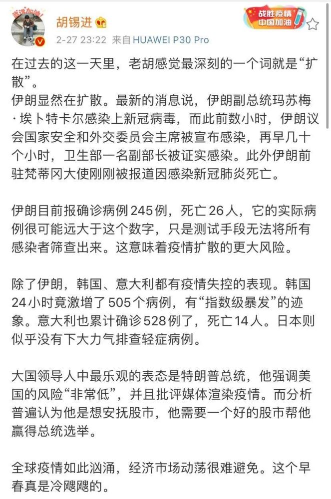 阅读讲话全文: 诸位阁下,亲爱的同事和朋友们: 首先,早上好。欢迎参加我们每周一次的2019冠状病毒病代表团通报会。我很高兴能够保持定期举行代表团通报会。 自上周三向大家介绍情势以来,情况发生了很大变化,这说明该流行病仍在快速演变。 截至日内瓦时间今天早上6点,中国已向世卫组织报告了78190例病例,包括2718例死亡。 昨天,除湖北省外,中国仅报告了10例新增病例。 但现在不是自我满足的时候。目前仍应继续保持警惕。 周一,世卫组织—中国联合专家考察组结束了考察并提交了报告。 如你们所知,专家组去了几个省,还去了疫情中心武汉市。 专家组对病毒的传染性、疾病的严重程度和所采取措施的效果得出了一系列结论。 他们发现,疫情在1月23日至2月2日期间达到高峰并稳定下来,之后一直在稳步下降。 他们发现病毒本身未发生明显变异。 专家组还估计,中国采取的措施避免了大量病例。 专家组报告载有大量其他信息,列明了我们仍无答案的问题,并提出了22项建议。 能够给所有国家带来希望、勇气和信心的关键信息是,这一病毒是可以控制的。 事实上,许多国家正是这样做的。有14个通报了病例的国家超过一周没有报告新病例。更重要的是,以下9个国家超过两周没有报告新病例:比利时、柬埔寨、芬兰、印度、尼泊尔、菲律宾、俄罗斯联邦、斯里兰卡和瑞典。 这并不意味着这些国家不会重现病例。但是此前发生的病例已经被控制住了。 在中国以外,目前37个国家有2790例病例,44例死亡。 昨天,中国境外报告的新增病例数首次超过了中国的新增病例数。 意大利、伊朗伊斯兰共和国和大韩民国病例的骤然增加,令人深感忧虑。 目前,巴林、伊拉克、科威特和阿曼出现了与伊朗有关的病例。 阿尔及利亚、奥地利、克罗地亚、德国、西班牙和瑞士目前出现了与意大利有关的病例。 昨天,世卫组织与欧洲疾病预防控制中心组成的一个联合小组抵达罗马,考察已实施的公共卫生措施,并提供技术支持。 世卫组织的一个小组将于本周末前往伊朗提供支持。 随着中国境外病例的增加,媒体和政界人士力推宣布本次疫情为大流行。但在对事实进行认真和清醒的分析之前,我们不应急于宣布这是一个大流行病。 世卫组织已经宣布本次疫情构成国际关注的突发公共卫生事件,这是我们的最高警戒级别。 轻易使用大流行这个词没有任何实际好处,反而有巨大风险,可能会加剧不必要和不合理的恐惧心理和污名化现象,并使系统陷入瘫痪。 它还可能意味着我们无法再控制这一病毒了。而情况并非如此。如果我们正确行事,就能赢得这场战斗。 当然,倘若大流行这个词是对局势的准确描述,我们会毫不犹豫地使用。 我们正在不分昼夜24小时监测疫情的演变,并就此问题与内部和外部专家进行交流。 目前,我们没有看到这种病毒持续密集在社区传播,也没有看到大规模的严重疾病或死亡。 在中国14亿人口中,不到8万病例。在世界其他地区,63亿人口中有2790例。 请不要误解我的意思。我并没有低估形势的严峻性,也没有低估它成为一场大流行病的可能性。它确实有变成大流行病的可能性。 一切皆有可能。 我们认为这种病毒具有大流行潜力。世卫组织正在为每个国家提供相应的防范工具。 在所有出现病例的国家中,首要目标必须是控制住病毒。正如我告诉各位的那样,有9个国家已经两周没有报告病例了。各国都应竭力防控。 与此同时,所有国家,无论是否有病例,都必须为潜在的大流行做好准备。 每个国家都需要做好准备,及早发现病例,隔离患者,追踪接触者,提供高质量的临床医护,防止医院暴发疫情,并防止社区传播。 有三大重点: 首先,所有国家都必须优先保护医务人员。 第二,我们必须促进社区参与,保护最有可能罹患严重疾病的人,特别是老年人和有基础性健康问题的人。 第三,为保护最脆弱的国家,我们必须尽最大努力在有能力的国家中控制住流行。 为了支持各国,世卫组织发布了支持国家做好准备和应对的业务规划指南。 这些指南提供了循序渐进的指导,要求围绕八个领域或支柱采取具体行动: 国家级的协调、规划和监测; 风险沟通和社区参与; 监测、快速反应小组和病例调查; 入境点; 国家实验室; 感染预防和控制; 病例管理; 运作支持和后勤保障。 指南还提供了关键绩效指标,并估算了防范和应对100个病例以下的聚集性病例所需的资源。 以上指南详见世卫组织网站,并可点击右上角切换中文查看部分指南中文版。 https://www.who.int/emergencies/diseases/novel-coronavirus-2019/technical-guidance
