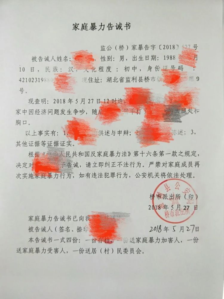 难开的告诫书 “蓝天下”的心理咨询师季碧梅告诉深一度记者,在帮扶的过程中她发现,很多地方的警察和法官至今对《反家庭暴力法》的条款还非常陌生。即使到现在,很多省市都需要他们提供告诫书的模板,在这背后,是理念的滞后。 季碧梅说,每次接到求助,他们的一项重要工作就是询问对方有没有拿到《家庭暴力告诫书》?如果没有,他们会第一时间把《反家庭暴力法》的内容发送给对方,“这个是必需要拿到手的。” 《家庭暴力告诫书》是《反家庭暴力法》中对家庭暴力受害人重要的保护手段之一,也是对施暴者的警醒。报警了,没有任何书面材料,依然会留有隐患。 万飞很认可湖北荆州市和监利市公安局的做法,当地拍了两期反家暴教学视频,实行全警培训,把处置家暴警情的方式由口头改为书面。在对警方的培训中,万飞常讲,及时开具告诫书对警察来说也是一种保护,能证明警察已规范作为,“即使发生类似最近网红拉姆那样的升级事件,他们也不会因没依法作为而被追责。” “告诫书对施暴者有很大的教育作用,它比口头教育的威慑力大很多。”万飞做过统计,截至2019年,监利市开出了六百多份告诫书,复发率百分之一点多,口头警告的复发率超过了百分之十。但在其他省市,很多当事人对告诫书的意义不重视,职能部门也一知半解。 2020年4月底,一位来自北京的当事人在听过一次直播分享以后,加了万飞的微信。最近再次被丈夫家暴后,她第一次选择报警,她向警察要求开具告诫书,但被拒绝了。警察告诉她,本地没有这个政策,只有外地才可以开。她不懂法,也不知道该怎么办。 万飞找到了北京市公安局下发的文件:《北京市公安局反家庭暴力告诫工作规范》。当值的警察看到这份文件以后,回复说要去查一查。在查到这份文件之后,他们开出了这家派出所的第一份《家庭暴力告诫书》。 “北京不是没有,而是这个派出所没有学习。”万飞说,很多基层派出所都有这样的问题,对文件学习不够。“我们要做的就是用法律、规章制度反作用于执法部门,推动他们开展工作。” 为了拿到一份告诫书,有时候可能还要用些“特殊手段”。 来自贵州的一位当事人,凌晨被老公打,挨到第二天早晨报警,警方同样拒绝开告诫书。即使万飞已经把法律文件发了过去,对方还是很坚决。当事人不知所措,万飞告诉她,那就不走了。一直耗到晚上,她终于拿到了告诫书,也是当地的首例。在面对不作为的公安机关时,万飞还曾遇到过当事人以录音相威胁才拿到告诫书的情况。他坦言,“不得已的时候,这也是一个方法。” 万飞收集了来自全国各地的家庭暴力告诫书,从内容到名称,五花八门。有派出所给出告诫书的依据不是《反家庭暴力法》,而是《治安管理处罚法》。佛山市一派出所开出的告诫书叫《反家庭暴力告诫书》,常州市公安局的告诫书名为《制止家庭暴力告诫书》。万飞说,“这在语法上就是不通顺的。家庭暴力告诫书是在告诫家庭暴力这种行为。反、制止,你还告诫什么?” 在众多告诫书中,最离谱的来自苏州市的一个派出所。该份告诫书把家庭暴力受害人的姓名写在了最前面,紧接着陈述“你实施的家庭暴力行为”、“现对你告诫如下”...... “我们是法治国家,要有规范的法律文书。全国出现了从名字到格式完全不同的告诫书,这非常的不规范。”万飞希望先从最基本的法律文书上做出改变,“一直这样下去,是很奇怪的事情。” 一纸告诫书,看似只是一个告诫,背后展现的是公权力机关对家暴的态度。告诫书一般一式四份,警方存档一份、一份交给家庭暴力受害人、一份交给家庭暴力加害者,另一份留社区(村委会)保管。 更重要的意义还在于它是当事人被家暴的证据。万飞说,规范的《家庭暴力告诫书》应该写明时间、地点、造成的后果、相关证据和被告诫人的签名,这在离婚的时候可以作为很重要的证据。 作为法官,杨忠也很认同,案件审理要有证据支撑,有了告诫书,法官可能会对家庭暴力受害人有所倾向,在某种程度上,甚至对判决有决定性作用。“有的家暴受害者,即使有医院的门诊病历,但没有报警记录,没有《家庭暴力告诫书》,没有《人身保护令》,我们也无从判断。”