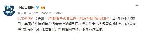 3位熟悉情况的人士透露,特朗普在电话里不但为近期糟糕的支持率数字痛骂帕斯卡尔,把自己的锅都甩给了他,甚至威胁要起诉他。 长安街知事(微信ID:Capitalnews)注意到,新冠疫情在美国爆发以来,特朗普将白宫每日疫情简报会当成了自己竞选连任的秀场。不过,在“注射消毒剂”言论之后,他调低了自己出席白宫每日疫情简报会的频率。 然而,特朗普在会上给出的不靠谱“建议”,又岂止“注射消毒剂”这一句,他对美国新冠疫情形势的误判,已让美国民众深陷新冠病毒的不幸当中。 截至北京时间30日9时,美国新冠病毒肺炎累计确诊1064194例,累计死亡61656例。 参考资料:海外网、环球网、央视新闻等 特朗普称中国将全力阻止其连任?耿爽:没兴趣“美国大选是美国的内部事务,中方没有兴趣进行干预,同时我们也希望美国政客不要拿中国说事儿。”据报道,美国总统特朗普周三在白宫接受路透社采访时宣称,中国“将竭尽所能”使他在11月的总统大选中连任失败。在4月30日举行的外交部例行记者会上,路透社记者就此事向发言人耿爽提问,耿爽表示,中国没兴趣干预美国大选。