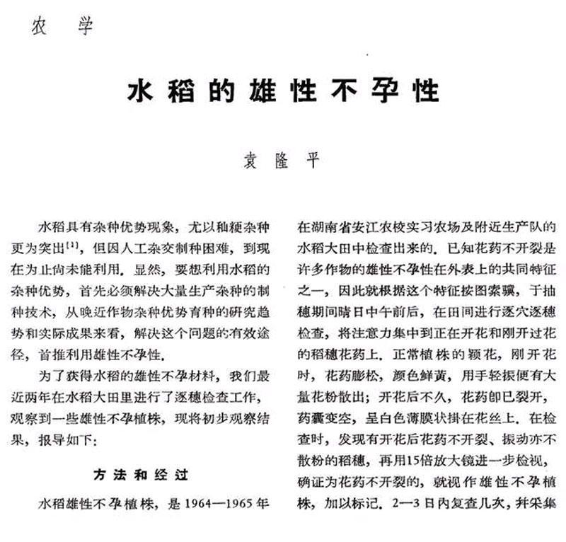 【一流英语追踪国际动向】 善于奔跑的马和耐力持久的驴杂交,产生的后代骡子兼具双亲的优势,这种现象称为“杂种优势”,在自然界中普遍存在。 人们很早就想将杂种优势现象应用到农作物生产中去,以培育兼具双亲优良农艺性状的杂交玉米、水稻和小麦。 但以水稻为例,它的每一朵花中既有雄蕊又有雌蕊,称之为“双性花”。 每一个稻穗上有上百朵或更多这样的小花,每一朵小花中的雄蕊产生的花粉与雌蕊授粉(称为“自花授粉”)。 最终花粉中的一个精细胞和雌蕊中的卵细胞结合发育成胚,另一个精细胞则与雌蕊中的中央细胞结合发育成胚乳。 成熟的胚和胚乳再加上包裹它们的种皮和谷壳,就构成了水稻种子,在适宜的条件下就可以萌发生长成一株新的水稻。 而我们食用的大米正是从水稻种子加工(去谷壳)而来的。 由于水稻天然的“双性花”和“自花授粉”的特点,如何才能使一株水稻的雄蕊花粉与另一株不同的水稻的雌蕊授粉、从而实现水稻杂交呢? 理论上,可以实施“人工去雄”:人为地去掉一株水稻的雄蕊,获得只有雌蕊的“雌水稻”作为母本; 研究杂交水稻第一人是原中国农科院院长丁颖(1888~1964),20世纪30年代就开始研究杂交水稻,并取得成果,此时袁隆平院士才出生。 但要生产足够多的杂交水稻种子,就要在大面积稻田中对着数不胜数的水稻植株进行海量的人工去雄工作,这在生产上是不现实的。 1963年,美国专家Henry Beachell首先成功实现了可批量产种的第一代杂交水稻技术, 1966 年培育出“奇迹稻”IR8。 但是,选育的杂交系不成功,性状和产量并没有实质提升。根据菲律宾农民的种植情况,在水热条件好得多的情况下,亩产在330-400公斤左右。 在当时封闭的中国,偏远得与国际无缘的湘西农校,袁隆平却始终根据优秀的英文功底,跟踪着国际学术期刊的动向,关注着美国、日本、菲律宾的水稻杂交研究进展。 1964年和1965年,袁隆平首先从自己的“胜利籼”、“矮特号”等水稻中,发现了6株雄性不育株。 它的雄蕊发育不正常,不能产生正常可育的花粉;而雌蕊发育正常,可以接受花粉完成受精。 将这些雄性不育株作为母本,经过授粉杂交后,证明杂交种具有生长优势和产量优势。