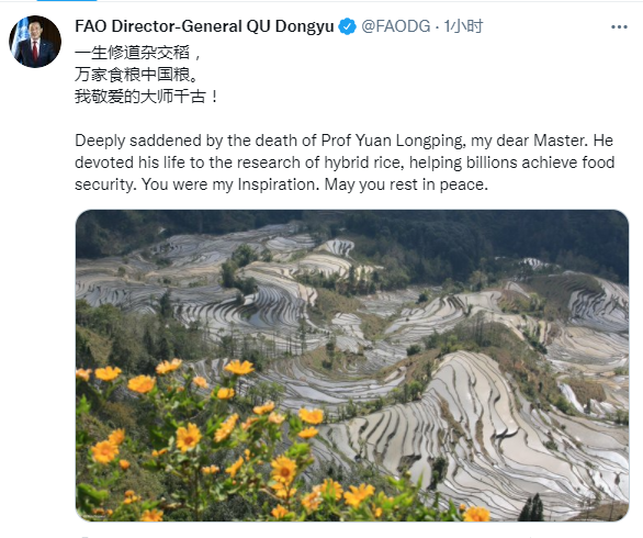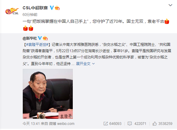 官方微信公众号发布了《再见,袁爷爷!》的悼文,称“发展杂交水稻,造福世界人民”是袁隆平毕生的追求。为了实现这一宏愿,他长期致力于促进杂交水稻走向世界。目前,杂交水稻已在印度、孟加拉、印度尼西亚、越南、菲律宾、美国、巴西、马达加斯加等国大面积种植,年种植面积达800万公顷,平均每公顷产量比当地优良品种高出2吨左右。 四川农业大学水稻研究所原所长李平: 袁老师是我国杂交水稻的旗手,在他的带领下使杂交水稻研究取得成功,为我国的粮食安全做出了不可磨灭的贡献。 隆平高科: 公司将深刻继承袁隆平院士“发展杂交水稻,造福世界人民”的伟大遗志,努力实现将杂交水稻技术推向世界!公司将以袁隆平院士为榜样,充分发扬隆平精神,勇做袁隆平院士杂交水稻事业的接班人,为隆平事业薪火相传贡献力量! 荃银高科: 袁隆平先生的功勋业绩和伟大精神将永远鼓舞我们广大种业人不忘初心、牢记使命、为发展我国杂交水稻和种子事业而努力奋斗! 记者:吴泽鹏、金喆、于垚峰、陈晴、王帆 编辑:汤辉
