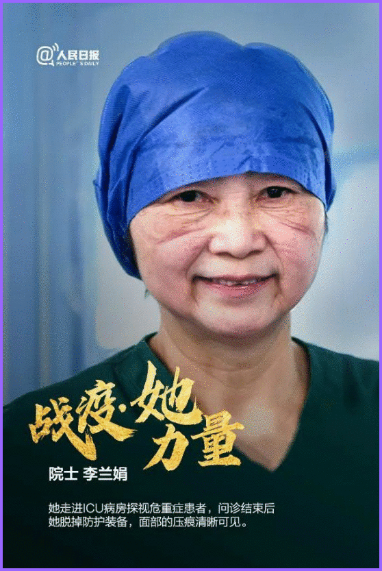 2月1日,李兰娟院士临危受命: 请您带队,支援武汉,即刻出发 是院士,也是战士 古稀老人冲上战“疫”一线 坚守在最危险的地方 她率先提出武汉“封城”的建议 扭转了抗击疫情的被动局面 她穿上厚重防护服走进重症病房 问诊新冠肺炎危重症患者 “这也有利于我直接了解他们的情况, 更好地与同事们讨论、制定治疗方案。” 脸上的压痕是“帅印” 更是撼人心魄的责任担当