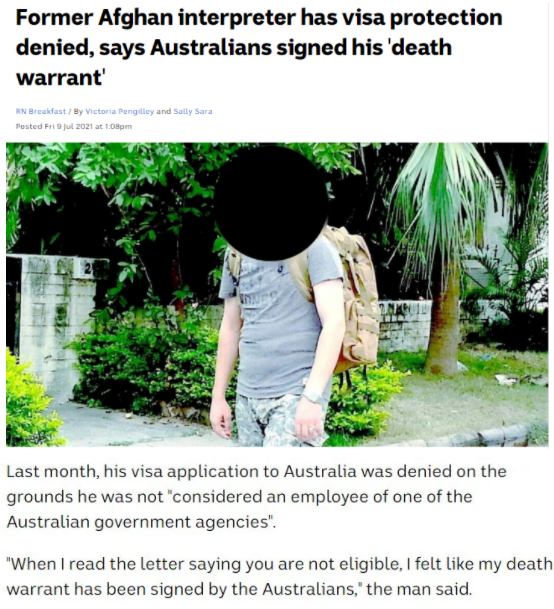 从追随美国入侵,到比美国更快地“逃离”,澳大利亚对阿富汗的“始乱终弃”和美国如出一辙。最直观的表现恐怕就是对阿富汗“合作者”的无情抛弃了。 据澳媒报道,目前有大批曾为驻阿澳军和澳方公司提供协助的前翻译、承包商和保安人员正寻求逃离阿富汗,但他们却被澳大利亚当局遗忘了。 一名曾受雇于澳军的前阿富汗口译员上月被澳方拒绝提供保护性签证,理由是他没有直接受雇于澳政府。该男子告诉澳媒,由于和澳军合作的经历,他经常面临死亡威胁。被拒签后,“我感觉澳大利亚已经签署了我的死刑执行令”。