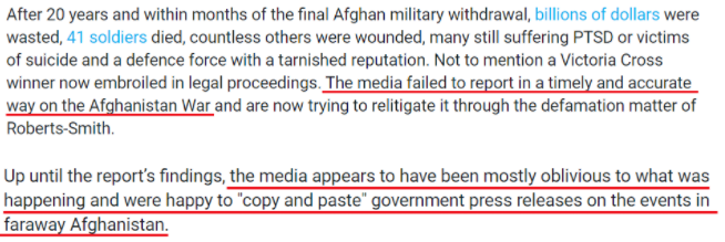 △《独立澳大利亚》(IndependentAustralia)报道截图(题图为阿富汗战争开始时的澳总理霍华德和美国防部长拉姆斯菲尔德)