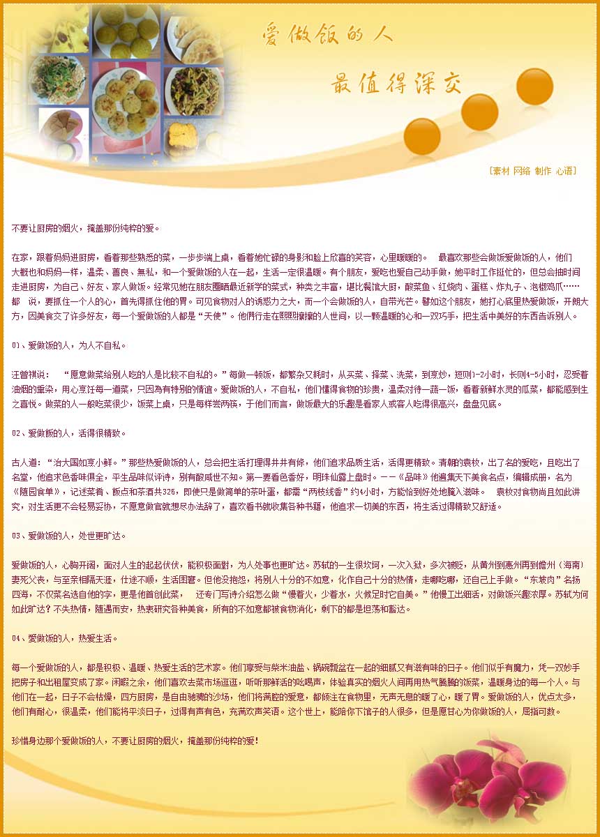 每一个爱做饭的人,都是积极、温暖、热爱生活的艺术家。他们享受与柴米油盐、锅碗瓢盆在一起的细腻又有滋有味的日子。他们似乎有魔力,凭一双妙手,把房子和出租屋变成了家。闲暇之余,他们喜欢去菜市场逛逛,听听那鲜活的吆喝声,体验真实的烟火人间,再用热气腾腾的饭菜,温暖身边的每一个人。与他们在一起,日子不会枯燥,四方厨房,是自由驰骋的沙场,他们将满腔的爱意,都倾注在食物里,无声无息的暖了心,暖了胃。爱做饭的人,优点太多,他们有耐心,很温柔,他们能将平淡日子,过得有声有色,充满欢声笑语。这个世上,能陪你下馆子的人很多,但是愿甘心为你做饭的人,屈指可数。