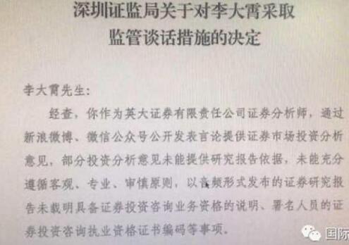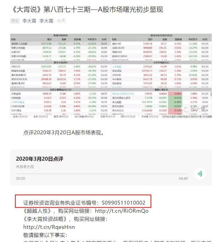 不过,之后的李大霄似乎有刻意玩噱头博眼球的嫌疑,其经典语录就包括: ·当赞美之音不绝于耳,股市的顶端渐渐成立,而每到意见最大时,股市底部往往悄然而至! ·如果说2008是狂风暴雨,2012就是和风细雨,而2013仅仅是毛毛雨中的毛毛雨! ·投资是一场比赛,比马拉松比赛时间更长,将来告诉你的孙子,爷爷若干年前给你买了一个 “李嘉诚”“巴非特”,留给你做创业的资本或生活的保障,而不是若干年前给你买了一堆股票,但它不见了。 ·我怕被人追杀 但现在我敢告诉大家可以买股票。 ·紧跟汇金走,吃喝啥都有!从2012年整年的市场来看,非常像一颗钻石,2132点,就是这个阳线实体的下面,1949点就是这个“十字心”的最低点,也就是2132点是钻石底,1949点是钻石尖! ·A股早已潜伏雄兵千百万,多空决战一触即发。 ·我依稀闻到了小牛身上的淡淡的气味,隐约看见了小牛的朦胧身影,听到了小牛在山间漫步的声音!也许牛还小,也许牛身上的担子太重,也许还需要给一点时间让它长大,但毕竟熊已老,仅仅是浪漫联想! ·6年熊市已经结束,中国股市苦尽甘来。 ·多头部队终会雄起 看到好股票口水直流。 ·6124点时充满泡沫,当时购进股票就像买棉花,而1664点及2132点处泡沫被压缩了,此时购进优质股票就像买进了压缩饼干! ·很多人,若干年后,摸着大牛股的小腿,只能含着泪水说:我曾经在钻石底抱过你一会儿。