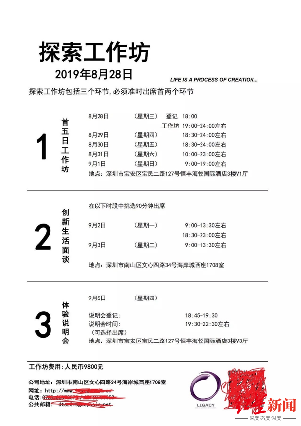 LEGACY官网信息称,LEGACY是一家致力于提升个人成长及企业永续的咨询顾问公司。不过工商信息显示,里程LEGACY实质上是一个项目品牌,其境内的运营方为北京诚泉文化发展有限公司。该公司成立于2010年,注册资本10万元,法人代表名为孟欢,持有该公司100%股份。经营范围包括组织文化艺术交流活动(不含棋牌)、承办展览展示、教育咨询等。2020年缴纳五险的员工为13人。 记者了解到,LEGACY发展新学员不会有任何报酬,很多人都是“抱着纯粹作贡献的心态去完成的”。LEGACY的授课团队分为导师和教练(助教)两个岗位,据周敏了解,行业内导师的正常价格为1万元一天,个别从香港、台湾请来的导师收费更高达2万元~3万元一天。而很多教练都是从优秀学员中选拔出来的,刘昕的一个朋友就曾在北京LEGACY做过兼职教练,这无疑给公司节省了一部分人力成本。 早在2010年,张玉就曾上过北京legacy的课程,在她看来,课程内容本身可圈可点,但她反感必须以介绍其他人来上课的要求。“他们会使用各种心理学方法和使命感的蛊惑,让你觉得介绍人来上课是一件功德无量的好事。” 张玉告诉记者:“这样的商业化道德绑架,却不给学员利益回馈,巧妙避开了传销的性质,但又达到了他们想要的结果。” 王成介绍,LEGACY课程会要求学员“感召”3个“海星”。不过如果不能完成目标,也不会有实质性的惩罚,但是会有压力,“没达成就是没遵守承诺,没有对自己的行为百分百负责”。 刘昕提到,她的老师曾提出只要她愿意报名课程,可以帮她支付学费。周敏做过的一个调查印证了这个说法。调查显示,80%的三阶段学员都会为别人垫付学费,“我的上线(推荐人)垫我的,我又垫我的下线(海星)的”。