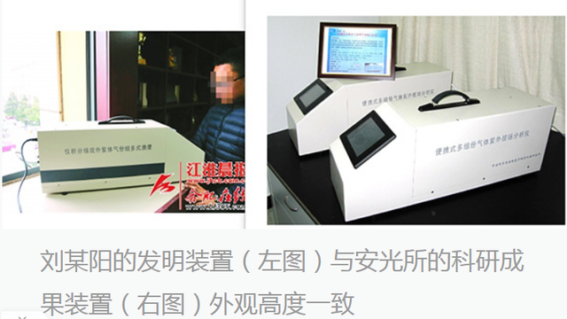 但该发明在名称、工作原理、外观方面,均与中科院合肥研究院安徽光学精密机械研究所2012年的一项科研成果高度一致。当时,刘建国任该所副所长,也是该科研成果所属项目的主要完成人。 此外,2018年就读合肥一六八中学的刘某阳再次凭借发明“酒驾安全激光快速筛查系统”,获得了多个奖项,并获国家专利。无独有偶,该发明也与刘建国2011年所申请的国家专利“激光酒驾道边在线监测系统”原理高度相似。 刘某阳当时的任课老师证实,该发明在研究过程中确实得到了刘某阳父亲刘建国的指导和帮助,“属于‘大手拉小手’,父亲的项目他也可以参与,就相当于父亲搞一点东西给他做。” 针对上述情况,澎湃新闻记者多次致电中国科学院合肥物质科学研究院,暂未联系到刘建国本人置评。 中科院合肥研究院干部拿科研成果供儿子获奖升学? 2015年,13岁的合肥初中生刘某阳因发明便携式雾霾检测装置,获得第30届全国青少年科技创新大赛三等奖,受到了媒体的广泛关注。 据全国青少年科技创新大赛官网介绍,刘某阳的发明全称为“便携式雾霾污染气体快速识别和检测装置”,该装置利用大气污染气体对紫外可见光的“指纹”吸收光谱特征,能够快速识别并定量检测大气中二氧化硫、二氧化氮、臭氧、苯、甲苯、二甲苯等10多种污染气体成分,为巡查污染企业排放、诊断大气污染来源提供依据。 在2015年3月20日合肥新闻网的报道中,刘某阳也将该发明称之为“便携式多组份气体紫外现场分析仪”,报道介绍该装置为“长方形的铁皮外壳,20厘米长,50厘米宽,上面还有两个提手,总重约有10斤”。刘某阳在采访中表示,自己是在学校老师的指导下开始学习光学知识,并向他人求教,用时一年多方试验成功。 凭借该发明,就读初一的刘某阳在合肥市第三十届青少年科技创新大赛上脱颖而出,入围省赛,并于同年获得第30届安徽青少年科技创新大赛科技发明类一等奖、第30届全国青少年科技创新大赛三等奖、2016年合肥蜀山区第八届青少年科技创新区长奖。