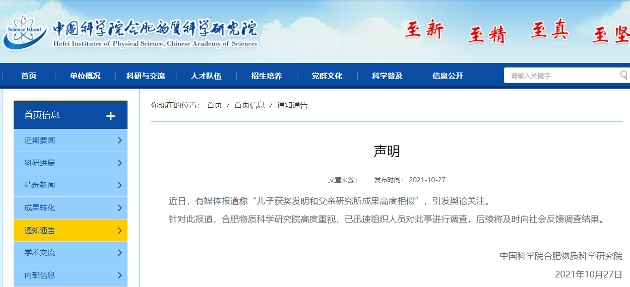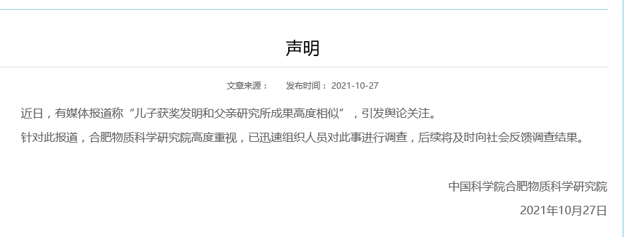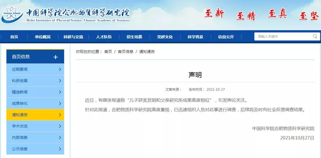 原标题:儿子获奖发明与父研究所成果一致还特招进重点高中?校方回应 安徽合肥一中学生刘某阳凭借发明“便携式雾霾污染气体快速识别和检测装置”获得多个省级、国家级奖项,以特长生身份被合肥重点高中一六八中学录取。刘某阳就读该校期间,再次凭借发明“酒驾安全激光快速筛查系统”,获得了多个奖项,并获国家专利。而这两项发明均与中国科学院合肥物质科学研究院的科研成果高度类似,而刘某阳的父亲刘建国在该研究院担任领导且主持了上诉两项研究项目。近日,此事引发广泛关注。 10月27日上午,合肥一六八中学校办工作人员称,学校招收特长生时只审核学生所提交的相关材料和证书,只要材料为真且符合招收条件即可,至于学生的获奖项目是否涉及抄袭等内容,应该由颁奖机构审核。同日,中国科学院合肥物质科学研究院官网发布声明:近日,有媒体报道称“儿子获奖发明和父亲研究所成果高度相似”,引发舆论关注。针对此报道,合肥物质科学研究院高度重视,已迅速组织人员对此事进行调查,后续将及时向社会反馈调查结果。 来源:@极目新闻 另据澎湃新闻报道:儿子获奖发明和父亲研究所成果高度相似,还不止一个 中科院实验室研究成果装置,转身变成一中学生科技竞赛作品?父亲的团队专利成果和儿子的“发明”高度相似?近日,中国科学院合肥物质科学研究院(以下简称“中科院合肥研究院”)院长刘建国被曝利用自己和实验室团队的科研成果,供儿子获奖升学。 刘某阳的发明装置(左图)与安光所的科研成果装置(右图)外观高度一致
