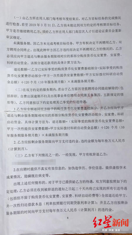在庭审中,钱老师提出了两项请求,一是确认与校方的聘用合同于2019年6月30日解除;二是请求裁定校方向其支付经济补偿金。在赔偿金方面,理由为,其辞职是因为学术自由权等权利受到损害而被迫辞职,根据《事业单位人事管理条例》、《劳动合同法实施条例》的相关规定,因用人单位违法,劳动者可以解除劳动合同的,不属于违反服务期约定,用人单位不得要求劳动者支付违约金。 校方则表示,钱老师违反了服务期约定,按照合同,应当退还大部分人才引进待遇。同时,教师方还需向学校支付未满服务期每年3万元的违约金。 红星新闻记者从校方与钱老师签订的“浙江财经大学引进高层次人才补充协议”中看到,对于违约责任,该份协议提到:“出现甲方因乙方违约而决定不再聘用乙方的情况,乙方必须向甲方退还与剩余服务期限相对应的那部分购房货币化安置费、安家费、科研启动资金”、“在服务期内,若乙方原因导致聘用合同提前解除的(包括辞职……等情形),乙方应全额退回甲方给予的购房货币化安置费基础部分,退还剩余服务期相对应的那部分购房货币化安置费浮动部分、安家费、科研启动资金。”同时,“乙方应按剩余服务期限向甲方支付违约金,违约金额为每年3万元”。 【校方回应】 1.救助流浪狗遭阻挠? 并非不允许,因流浪猫狗威胁到校园安全而多次沟通 对于钱老师所称进行动物救助和保护研究被阻挠才“被迫辞职”的说法,5月29日,校宣传部相关负责人回应,并非阻止其救助和相关学术研究,而是校园流浪猫狗已经威胁到校园安全,校方曾多次与钱老师沟通是否可以将校内的猫狗换一个场所,但钱老师比较固执。 该负责人称,关于流浪狗的事情已经有好几年了,就学校的情况而言,从刚开始一两只流浪狗到高峰时期有20多只,还有10多只流浪猫,“刚开始学校也是很支持的,但后面出现了破坏性的情况,一是危及到了学生安全,有流浪狗追赶学生的事件发生,而大多数学生尤其是女孩子其实是害怕狗的,有很多学生反应此事,而是破坏了校园的公共卫生”。 “鉴于这种情况,从学生安全的角度考虑,学校保卫处在去年集中稍微处理了一下,过程中与钱老师也进行了多次的沟通。”该负责人说,“建议钱老师能不能适当地递减(数量)或者圈养到其他地方去,因为校内确实不安全。” 该负责人同时称,钱老师离职与动物救助这件事没有关系,可能是其个人在学术上或者其他各方面,以及人事处人才引进方案上有一些自己的想法。 该负责人称,校方不允许其做动物救助和研究是钱老师个人臆测,学校并非不允许,“只是说用怎样适当的方式和形式去做,学生有爱心是对的,去圈养流浪狗也是鼓励的,但是因为规模一旦扩大下去是没法控制的”。 对此,钱老师认为该负责人的说法“是对事实的歪曲”。她表示,自2018年3月开始与同学一起开始对校内的流浪动物进行绝育、免疫、领养的科学救助,校内流浪动物越来越少,校园越来越安全,“但校方都在阻止同学们救助动物,学生协会也被注销,这也可以看到高校流浪动物救助的艰难”。 2.对于离职索赔: 作为法学专家签合同时应该有数,结果以仲裁为准 对于离职索赔,浙江财经大学校人事处、高层次人才建设办公室、党委教师工作部副处长胡先生向红星新闻记者回应,钱老师为学校引进人才,所涉及的购房安置费等已经支付给了钱老师,学校向钱老师所提出的退还人才引进福利及涉及的违约金确为55万余元。 其介绍,钱老师离职之事,从学校本身来说,一直对其极力挽留。但现在离职,因为服务期没有满,则需要退还学校部分的费用。 胡先生介绍,所涉的违约金部分,在一开始跟钱老师协商的时候,是可以给她减免的,而目前,既然钱老师已经提起了仲裁申请,校方的诉求中就包括违约金这一块了,因为合同写着的。对于合同中其他的一些人才引进的待遇费用则是按照合同约定需要钱老师退还的。 “我相信她作为一个法律的专家签合同的时候,自己应该也是有数的,这个条款是直接签在那里的,你说现在又不认?”胡先生说。 对于到底是谁违约了,因正在仲裁阶段,胡先生表示目前也不好作太多结论性的回答。“既然现在她离职的事情已经到劳动人事仲裁了,那么我想仲裁部门也会有自己的依据给出裁决的,还是以裁决结果为准”。 红星新闻记者 杜玉全 受访者供图