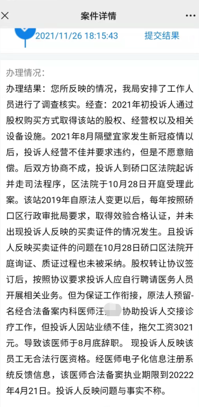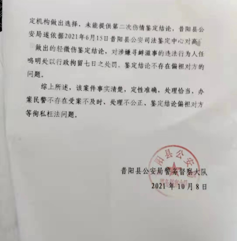 举报信称,5月29日,高先生向派出所提出进行伤情鉴定,但是一直被以高先生妻子尚未出院、领导不在无法签字、法医不在等理由拖延。直到6月15日,才对高先生与妻子的伤情进行了鉴定,鉴定结果显示均构成轻微伤。高先生咨询了律师,得知寻衅滋事构成两人轻微伤可以构成刑事案件,但当他领到此案的行政处罚决定书,显示仅对那名光头男子处以行政处罚。 在一份盖有昔阳县公安局警务督察大队公章,时间为2021年10月8日的答复函显示,公安机关认定的案件情况是,高先生与妻子在昔阳县乐平镇安坪村经营“回头率”理发店。5月25日中午,任某、聂某、梁某三人在安坪村饭店吃饭喝酒,16时许三人酒后经过“回头率”理发店时,进入理发店打算给聂某剪头发,任某在对店内观察时,自认为高先生斜眼看自己,心生怒气,遂上前掐住其脖子,推到里屋床边,高先生妻子听到声音后进入里屋劝架,梁某、聂某也先后进入里屋,梁某对任某进行拉拽,任某才松手,后高先生妻子将任某三人劝离。 6月15日,昔阳县公安司法鉴定中心鉴定高先生夫妇的损伤为轻微伤。7月1日,昔阳县公安局对涉嫌寻衅滋事的违法行为人任某处以行政拘留七日的处罚。 高先生不服该决定,提起行政复议。“后来,我接到公安机关电话,让我去领行政复议决定书,是维持原决定。”