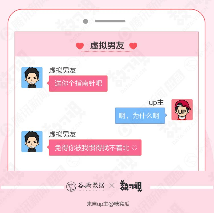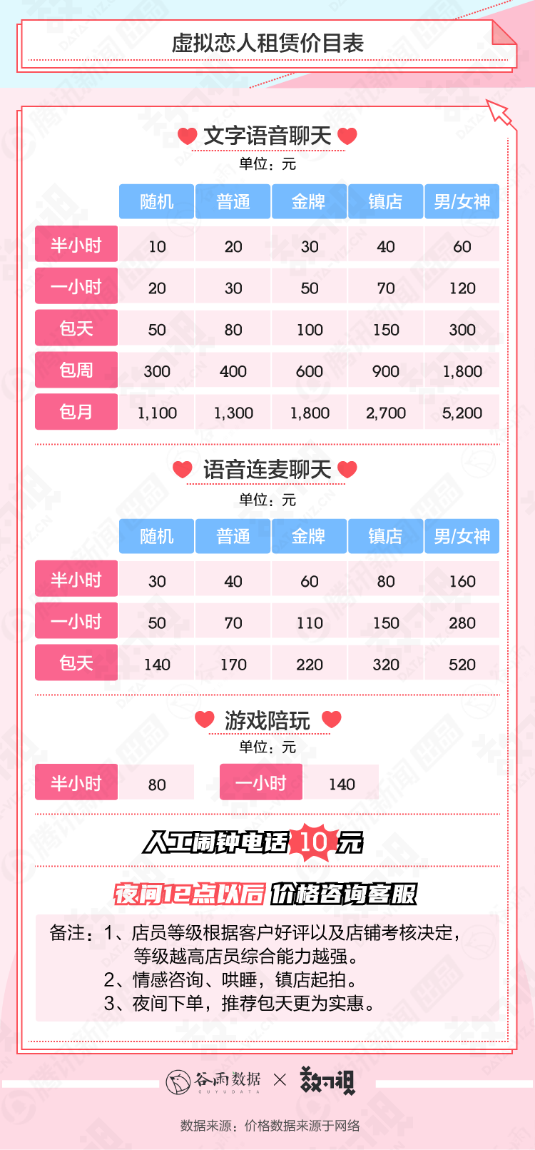 这样看热闹不用花钱的小把戏,总能让观看视频的年轻人们乐此不疲。不管套路多高级,能收获一场短暂的快乐才是终极命题。 虚拟的订单,现实的需求 《中国统计年鉴》显示,截至2018年,中国的单身人口数量已经突破了2.4亿。庞大的市场需求让虚拟恋人成为一个不小的产业。 据媒体报道,在2014年,甚至更早之前,网购店铺就已经提供相关服务,花上十几、几十元,就能定制一个虚拟恋人,提供清晨叫早、夜晚哄睡、陪玩陪聊等服务。而将这样的服务拍成视频,是最近几个月才火爆起来的事。 这张在网络上流传的价目表显示,虚拟恋人根据段位分为不同级别,级别越高费用也越高。如果要租上一个镇店级别的虚拟男友语音连麦,每小时要花上150元。 不过,在这类虚拟恋爱的交易中,也有一些别有用心的人提供十分暧昧的服务内容,在灰色地带打擦边球。如今,不少网购页面已下架“虚拟恋人”类产品,但通过搜索“小哥哥”“陪聊”等关联的关键词,仍然可以搜索到相关服务。 从前车马很慢,一生只够爱一个人;如今网速很快,半生都没找到一个爱的人。 “不知道什么时候开始,什么东西都可以虚拟,音乐可以,画画可以,游戏可以,连爱情都可以。”这段十多年前电影《虚拟人生》里的台词,如今成了真。 都说出生在互联网时代的年轻人,善于用虚拟的快乐来治愈现实的痛苦,但爽就够了,管他真的假的呢。 数据&撰文 | 榆木*易可欣*行者* 设计 | 翁卓异*何笠* 编辑 | 赤兔 *为共同版权方数可视成员 出品人 | 杨瑞春 主编 | 王波 责编 | 郝昊 运营 | 张琳悦 苏现奎 出品|腾-讯新闻谷雨工作室