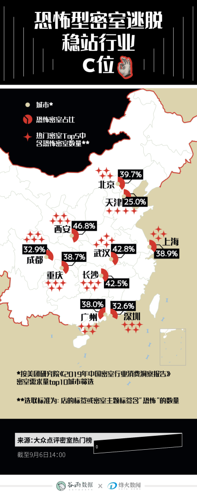 出品丨腾-讯新闻谷雨工作室 是什么?让邓伦吓到模糊? 是什么?让杨幂花容失色? 究竟是道德的沦丧,还是人性的泯灭?欢迎走进今日的谷雨数据之《详解恐怖密室逃脱》。 这个夏天,随着网综《密室大逃脱第二季》的热播,恐怖型的密室逃脱火出了"圈"。 微博上,#沉浸式密室有多好玩#一时成为网友的热议话题,另一话题#密室监控行为大赏#下,则记录了很多玩家在恐怖密室里放飞自我的愉(diu)悦(ren)瞬间。 密室老炮们吐槽着节目其实一点都不吓人;而那些密室小白,一边跟随着密逃团揪着心,一边难忍好奇,颤颤巍巍地搜索线下最受欢迎的密室逃脱体验店,摩拳擦掌,蓄势待发。 那么,都是什么人在玩密逃?恐怖密室到底有多可怕? 火出“圈"的密室逃脱 钱(wo)钟(zi)书(ji)先(shuo)生(的)曾有一个精准的比喻:"密室逃脱就像一座围城,室外的人想进去,室内的人想出来。" 简单来说,密室逃脱是一款烧脑益智冒险类游戏,汇聚了智力解谜、剧情体验、体力探险等多重要素。 它会根据不同的故事背景,将玩家困在封闭的主题空间中。玩家需在规定时间内研究周围的蛛丝马迹,从而打开通向外面的门。 因网综走红的恐怖密室,则是在玩家寻找线索的过程中,加入悬疑、惊悚元素。 呼兰在脱口秀大会上,把恐怖密室逃脱比喻成中年危机:跑不动,也跑不掉。 在幽暗阴森的小屋子里,还要面对时不时出现的"鬼",胆大的已经四下乱窜,胆小的早就呆若木鸡。