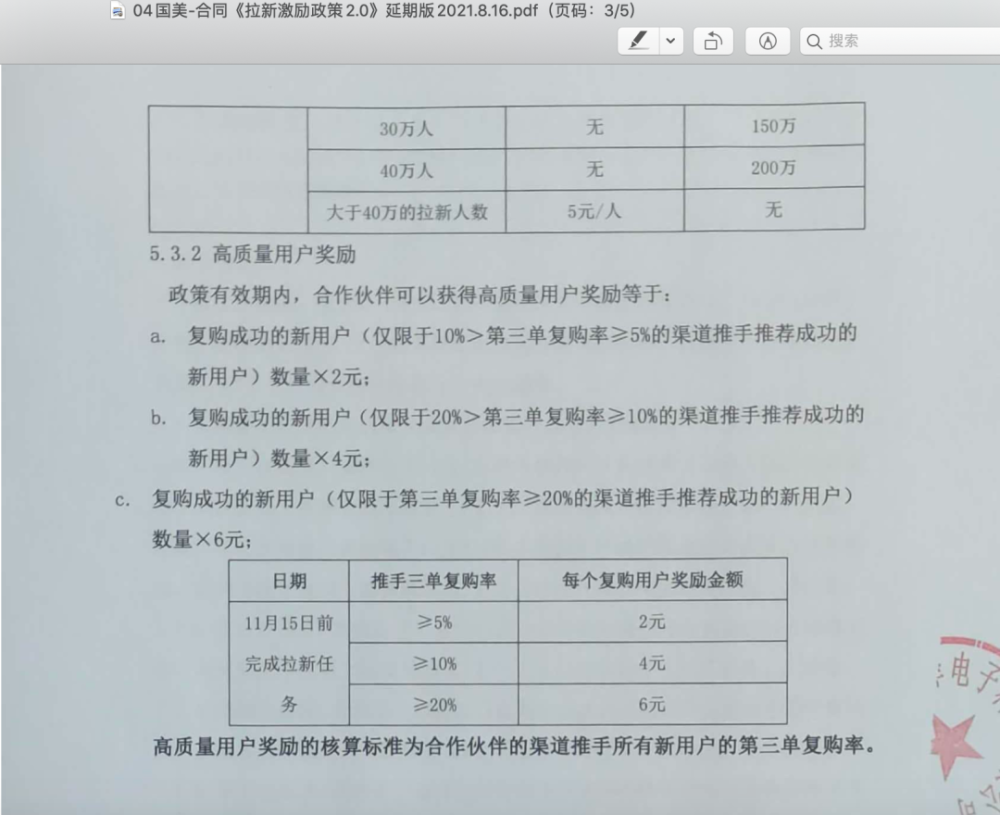这一数字即便与2个月前相比,也有不小浮动。2月10日,在国美零售“家·生活”战略业务进展全球投资人电话会上,方巍曾表示截至2022年1月,真快乐MAU达7000万,DAU达到350万。 财报中,国美没有单独披露真快乐2021年的GMV。但方巍表示:“2022年,真快乐APP的GMV预计将超过2000亿元。”——此数字已超过了2021年国美的GMV总额。 以上数据,与外界对真快乐的实际观感大相径庭。过去一年来,用户打开真快乐APP,在首页推荐的爆款销售记录下,评论条数经常只有数十至数百条不等。实际上,据张凡和多位提供拉新服务的代理商透露:真快乐的DAU应该只有官方披露的1/10甚至更低。 “真快乐的APP端实际流量非常少。去年10月前,拉新高峰时DAU能达到60万。一旦不投入拉新,用户就会迅速下降到20万以下。”张凡对作者说。 他同时透露,国美会在朋友圈、头条或社群中做一些广告定点投放,“只要用户点击过,都算在DAU里。这样也能做到一天三四百万的数据,但都是一些假用户,不可能达成留存”。 来自安徽和大连的两位拉新代理商也向作者表达了相似观点:国美在得到用户后,后续缺少补贴、裂变等运营手段,这些用户基本都用完即走。