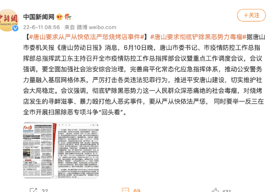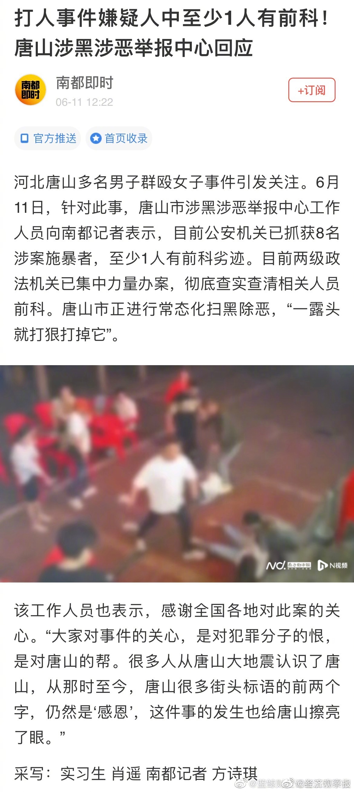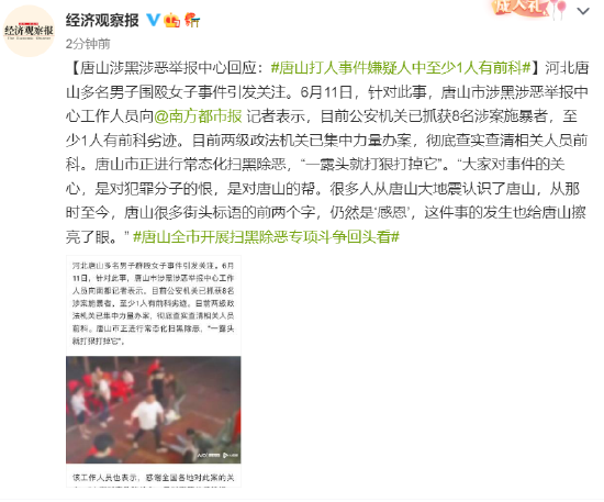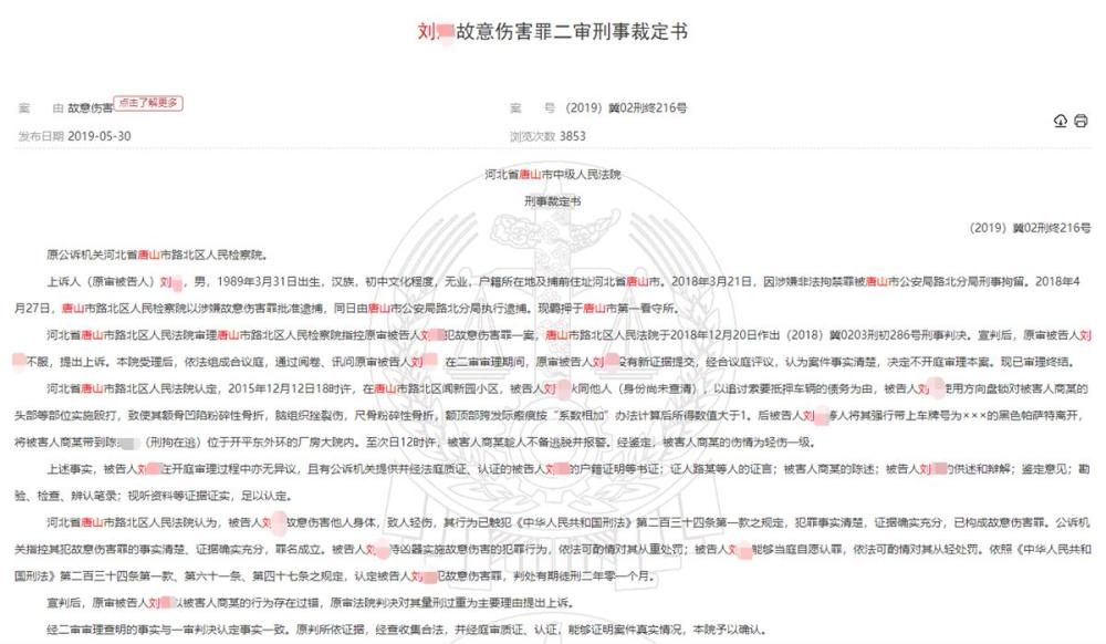 信息显示,这家水产养殖公司已处于吊销状态。而陈某志牵涉多起司法案件,多次成为失信被执行人,并被限制高消费,即所谓的“老赖”。据上游新闻报道,6月11日早上5时许,警方发布通报称,在当日凌晨又抓获李某瑞等3名涉案人员,工商资料显示,在陈某志的合作伙伴中正有一名李某瑞,职务为该水产品养殖有限责任公司监事。 中国裁判文书网一份2019年公开的刑事裁定书披露,陈某志曾为构成故意伤害罪的刘某提供拘禁场所,而在裁定书中,陈某志被标注为刑拘在逃。裁定书中提到的涉案人员刘某,与市民所说“唐山烧烤店打人”案件另一嫌疑犯同名。但二者是否为同一人,暂未获得警方确认。而另一份民事判决书显示,陈某志还因不当得利纠纷被诉诸法庭,陈某志多次找人代订机票,但拖欠机票款未付,法院判其支付原告款项及利息三万余元。后因全部未履行,法院将其列为失信被执行人,并限制其高消费。 刘某曾非法拘禁殴打他人致额骨凹陷 据中国裁判文书网记载的信息,刘某在1989年出生,户籍所在地为河北省唐山市。 公开信息显示,2015年12月12日,在唐山市路北区闻新园小区,刘某伙同他人,以追讨索要抵押车辆的债务为由,使用方向盘锁对商某实施殴打,致使商某额骨凹陷粉碎性骨折,脑组织挫裂伤,尺骨粉碎性骨折。随后,刘某将商某强行带离,后商某逃脱,报警。