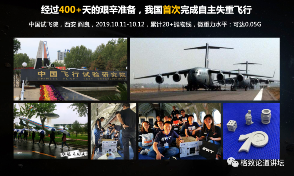 回到实验室,我们希望探究这样的工艺是不是还能够适应更多有价值的零件。所以,我们用它制备了很多种比较精密的工业产品,甚至用它来制造模拟月壤材料的结构,得到了非常不错的效果。 我们还有一个想法,如果这样的工艺能够制造金属材料,那么就可以用一种工艺来适应高分子材料、陶瓷材料,以及金属材料,这样太空中大多数的材料类型用一个设备,一种工艺就可以全部解决。 当时我提出了一个异想天开的想法,为什么不能用我们国家的飞机来做这种失重飞行呢? 这确实是一个非常大胆的想法,熟悉我国航天领域的人都知道,失重飞机在我们国家航天界已经期盼很久了,但是因为种种原因不能成为现实,因为它需要性能优异的飞机,需要飞机的改装能力,需要足够大的空域,还需要非常优秀的飞行员,以及经过缜密计算的飞行轨迹。 我们没有其他办法,只能去想办法创造这样的条件。仔细分析之后,发现在中国只有一个单位能够把上述的要素全部聚齐,这个单位就是位于西安阎良的中国试飞院。 这个单位很了不起,我们国家所有的军机、民机,包括去年阅兵时看到的飞机都是在这里进行飞行鉴定的。我在联系他们之前很忐忑,忐忑的原因是因为我知道我的实验经费是非常有限的,这种感觉就像你只能买得起一张经济舱的飞机票,但是你要去问别人,能不能把一架飞机包给你一样。 所以,我知道这样的要求有点过分,但是没有办法,我还是联系了他们。非常非常幸运的是,我遇到了一些和我有同样想法的人,他们也对中国能够拥有自己的失重飞机期待已久,所以在我提出这个想法之后,我们很快达成了共识,一起来推动这件事。 经过400多天的努力,飞机的改装,飞行方案一轮一轮的校对,我们都做了精心的准备,最后由中国试飞院的副院长亲自驾驶飞机,那天几乎所有留在试飞院的领导都来到了现场,大家都很激动。 实验成功以后,由于一些信息不能对外公开,所以并没有进行大量的报道,这些我们都很理解。实验成功时,我虽然没有像想象中那样和大家抱头痛哭,但是我真的很激动。我代表整个团队向帮助我们的所有人表示感谢,因为他们不仅帮我们完成了实验,也为国内很多想利用失重飞机开展实验的人打开了一扇门。我很荣幸,我们的实验是第一个,我成为了那个敲门的人,这个实验完成以后,我们第一阶段工作就做完了。